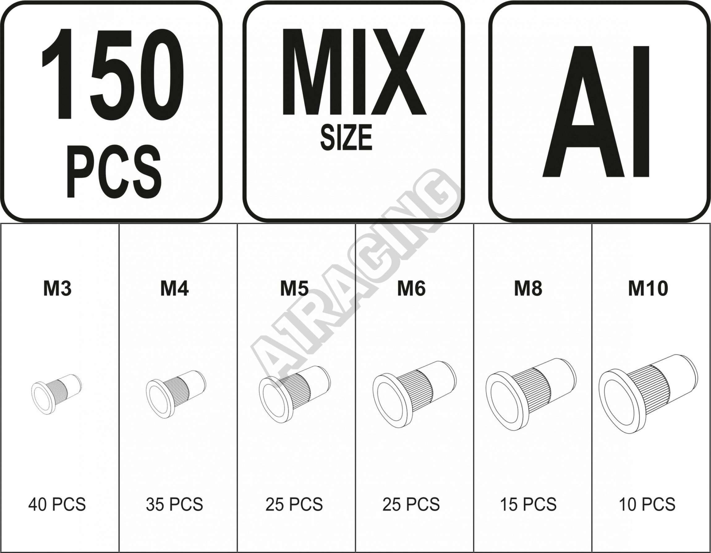 Nýtovací matice hliníková sada150 ks M3-M1010.59 EUR