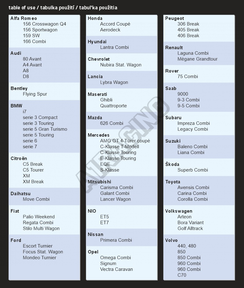 | Toyota | Avensis Combi, Carina Combi, Corolla Combi |