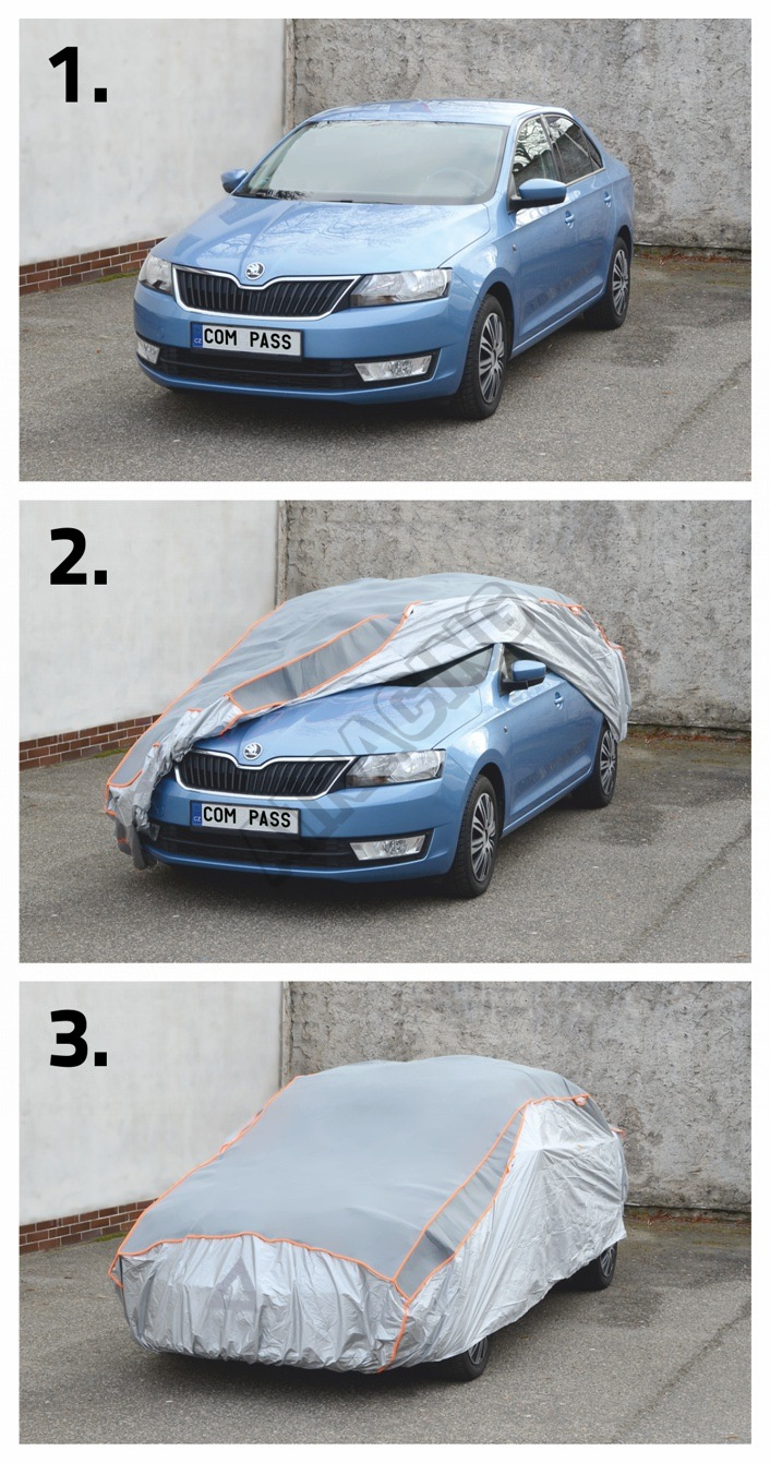 Jednoduché upevnenie plachty - iba sa nasadí na automobil, na spodku sa upevní časť so všitou gumou za vhodné záhyby karosérie/nárazníka a predná aj zadná časť plachty sa dôkladne upevní pomocou všitých popruhov so sponami.