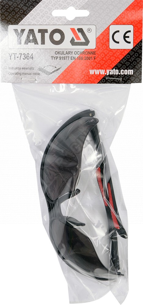 Tmavé ochranné okuliare z polykarbonátu, s dĺžkovo nastaviteľnými ramienkami, ktoré je možné navyše pomocou otvorov na koncoch opatriť napr. gumičkou na zavesenie na krk. Dosadacie plochy s tvárou sú pre pohodlnejšie nosenie polstrované.