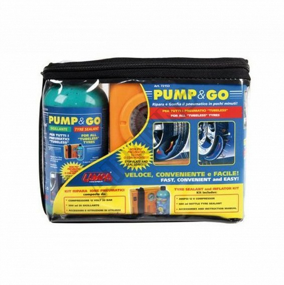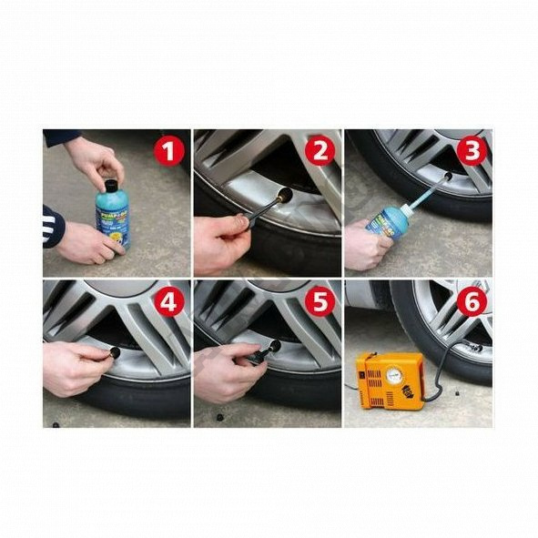Kompletná sada pre rýchlu opravu píchlých pneumatík. Súčasťou balíka opráv je aj vzduchový kompresor 12 V / 18 bar. Už nemusíte demontovať koleso, alebo používať hever. Jednoducho použijete tento gél a následne pomocou kompresora dohustíme pneumatiku a môžete pokračovať v jazde. 450 ml gélu je dostatočné množstvo pre všetky súčasné pneumatiky. Určené pre bežné defekty, nie pre bočné trhliny.
