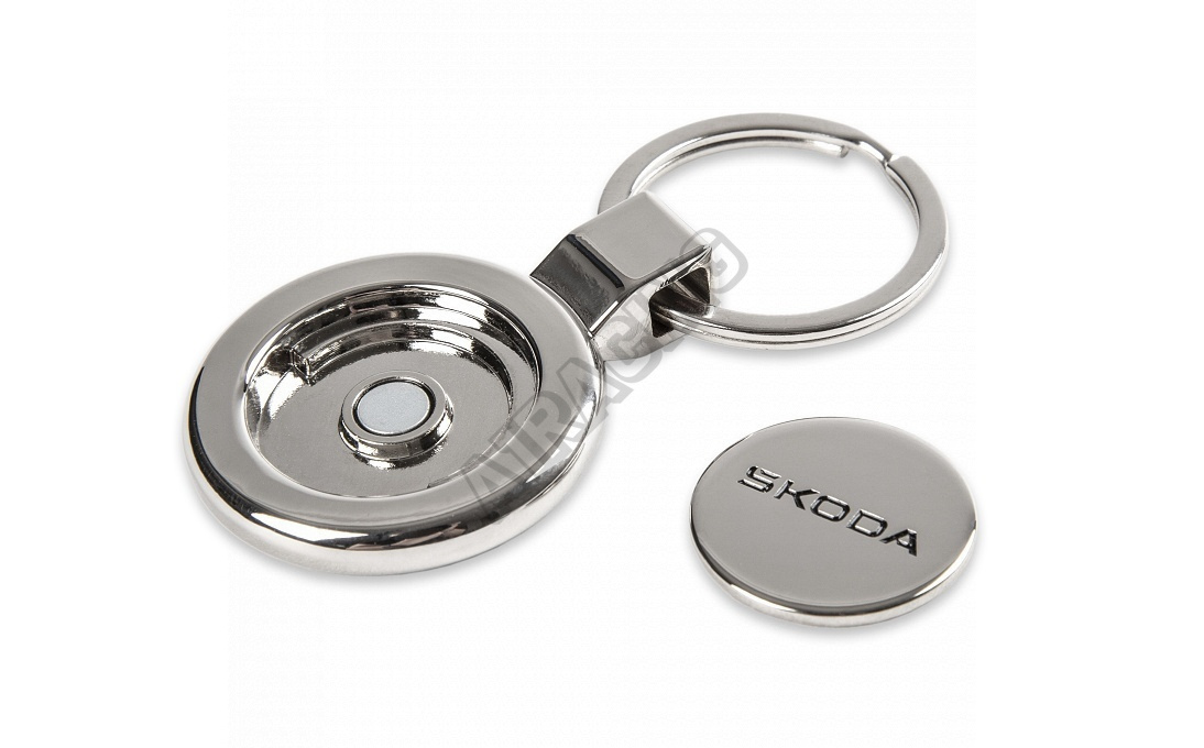 Kovová kľúčenka s logom ŠKODA s odnímateľným žetónom na zadnej strane. Veľkosť žetónu zodpovedá minci v hodnote 10 CZK.
