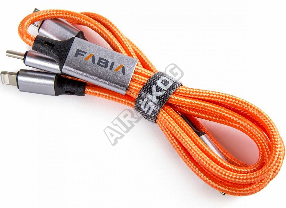 Nabíjací USB kábel 3v1 s brandingom FABIA. Konektory USB-C a trojkombinácia micro USB, USB-C, Lightning. Dĺžka 80 cm.