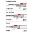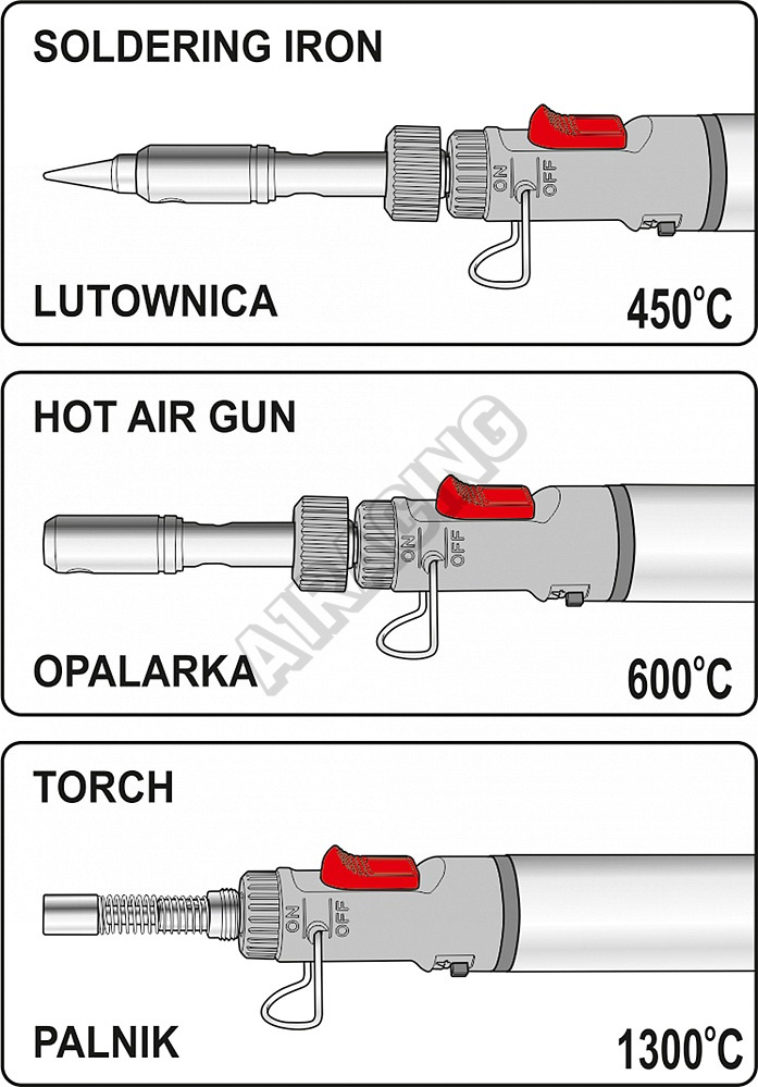 Plynová pájka 3v1 poháněná Propan-Butanem. Lze použít jako pájku při 450 °C, opalovací pistoli při 1