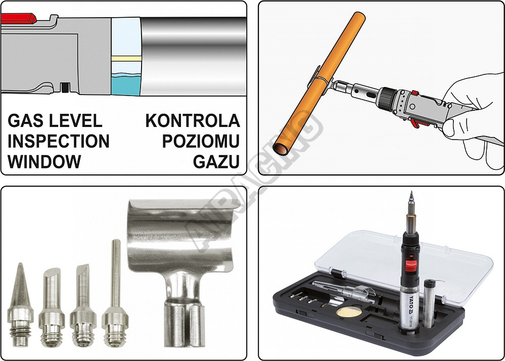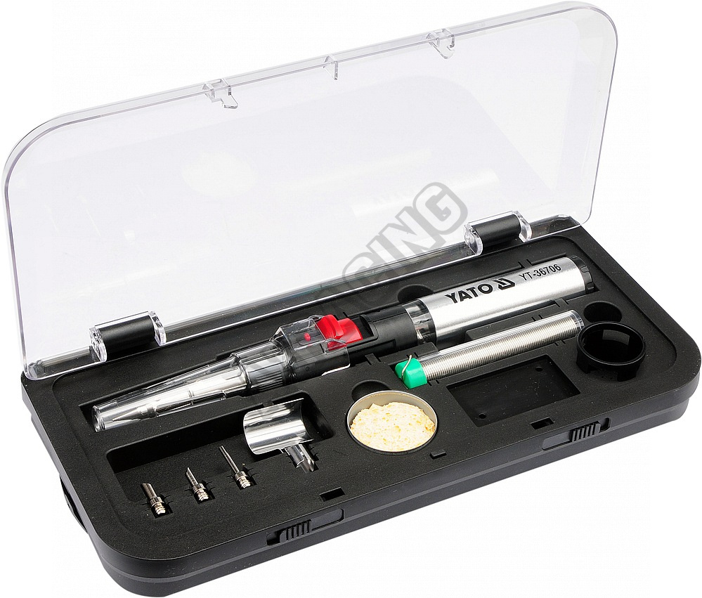 Plynová pájka 3v1 poháněná Propan-Butanem. Lze použít jako pájku při 450 °C, opalovací pistoli při