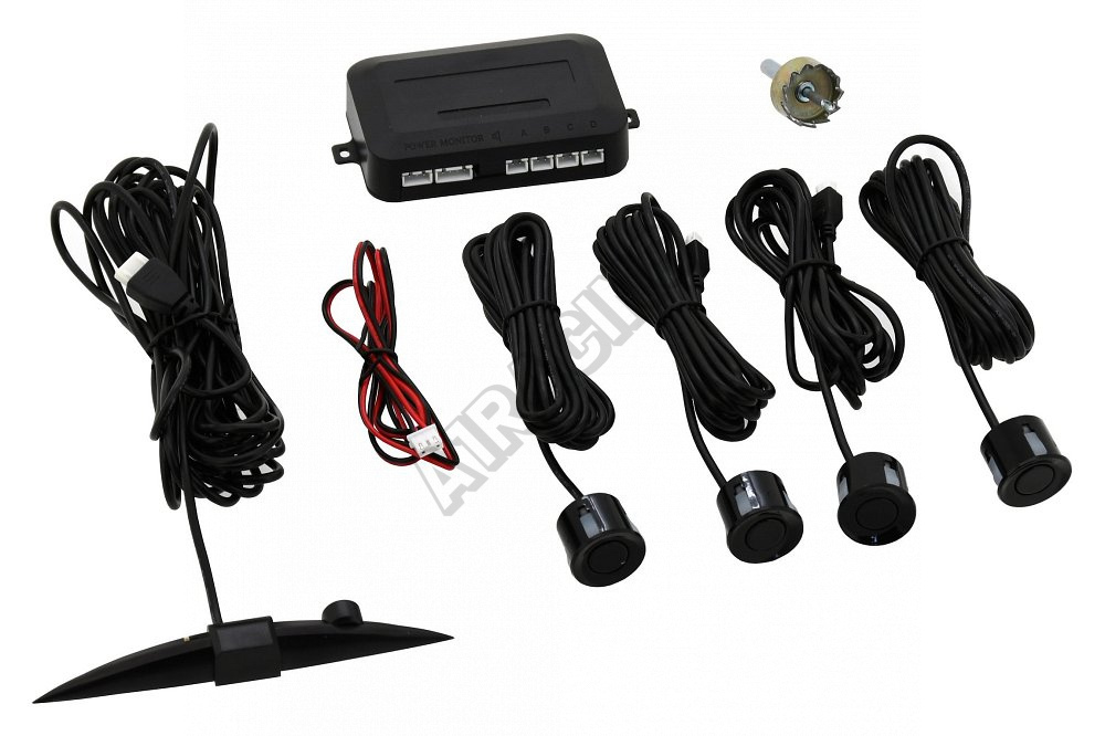 Balenie obsahuje displej, riadiacu jednotku, 4 senzory pre montáž do zadného nárazníka, zodpovedajúce kabeláž a vrták zodpovedajúceho priemeru.