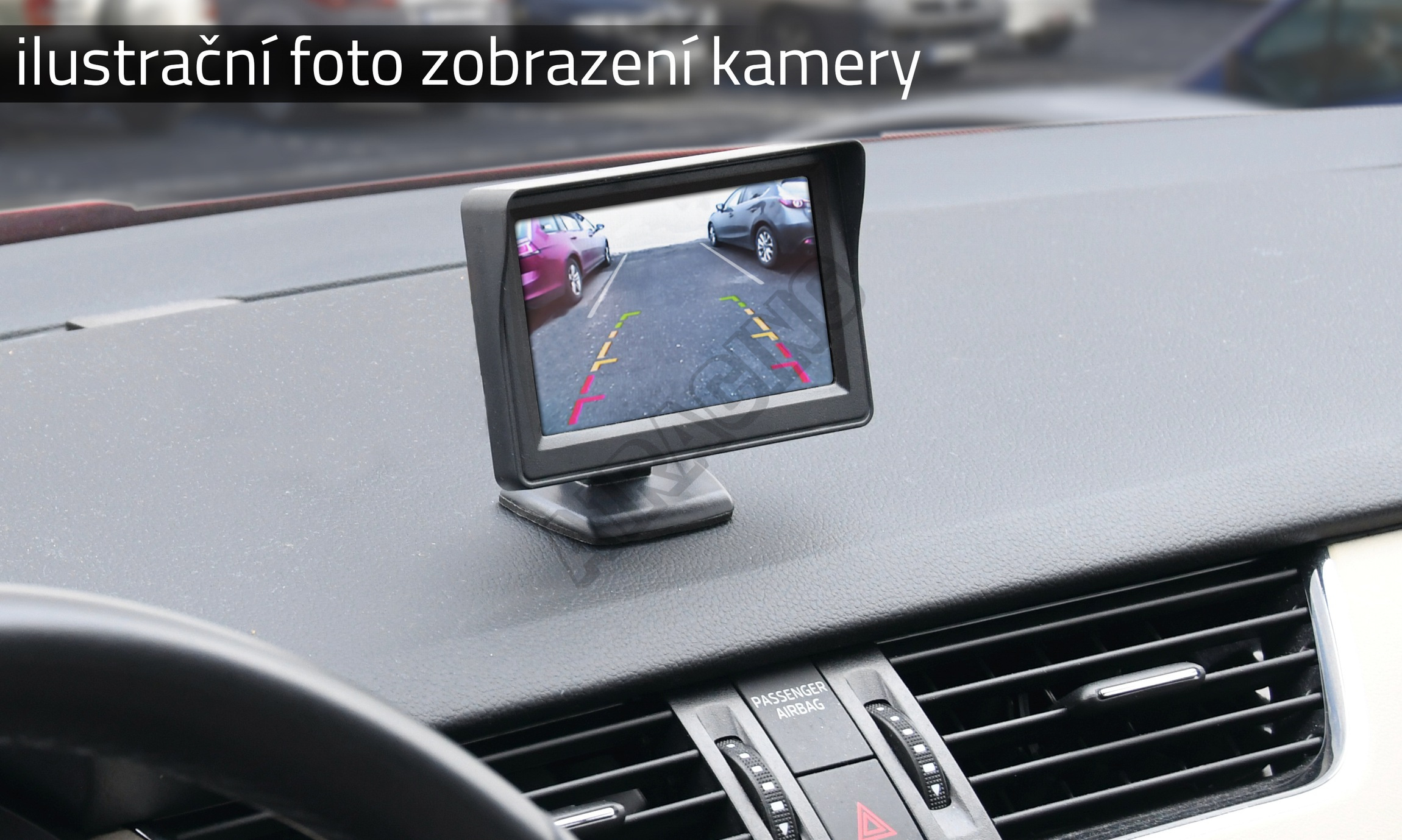 Bezdrátová parkovací kamera s úhlem záběru 120°. Určeno pro montáž na předem určené místo v zadní části vozu.