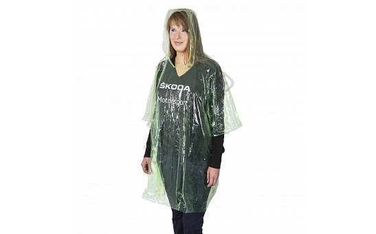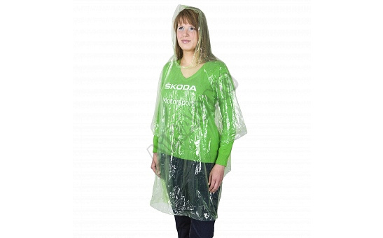 Originálne pláštenka v strihu ponča. Biely nápis Škoda Motorsport vo veľ. 20cm na hrudi. Pláštenku možno zabaliť do kompaktného obalu v tvare gule, priemer 6,3cm s karabínou.