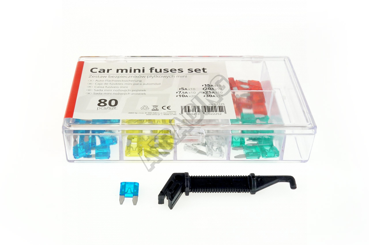 - Obsah súpravy: 10x5A, 10x7.5A, 20x10A, 10x15A, 10x20A, 10x25A, 10x30A, kliešte (úchop)