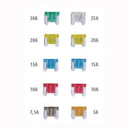 Sada 10 kusů nožových pojistek mini, pro použití v automobilech (max. 24V). Obsah balení: 1x5A, 1x7, 5A, 2x10A, 2x15A, 2x20A, 1x25A, 1x30A