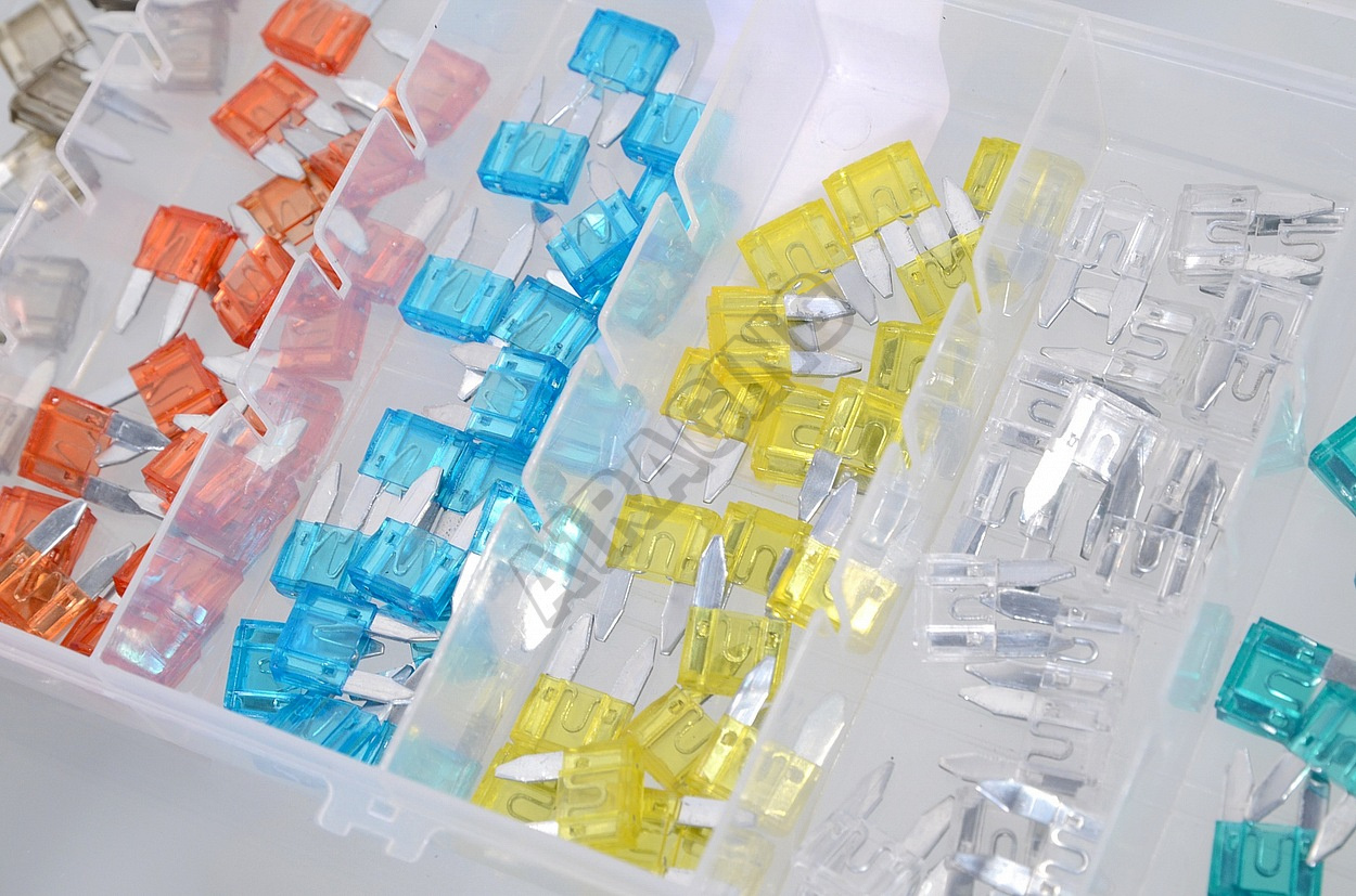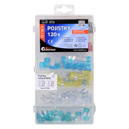 Celkem 120 pojistek v přehledném, přihrádkami opatřeném kufříku. Pojistky jsou určeny pro napětí do 50 V a jsou certifikovány, materiál zinek v kombinaci s plastem.