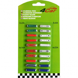 Pojistky válečkové: Komplet / 20 ks / válečkových pojistek. 2x5AMP, 8x8AMP, 6x16AMP, 4x25AMP.