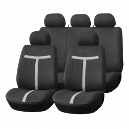 Súprava 9-dielna zahŕňa poťahy na dve predné sedadlá, zadnú delenú lavicu a súpravu opierok hlavy. Univerzálne prispôsobenie pre väčšinu modelov osobných automobilov.