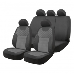 Súprava 9-dielna zahŕňa poťahy na dve predné sedadlá, zadnú delenú lavicu a súpravu opierok hlavy. Univerzálne prispôsobenie pre väčšinu modelov osobných automobilov.