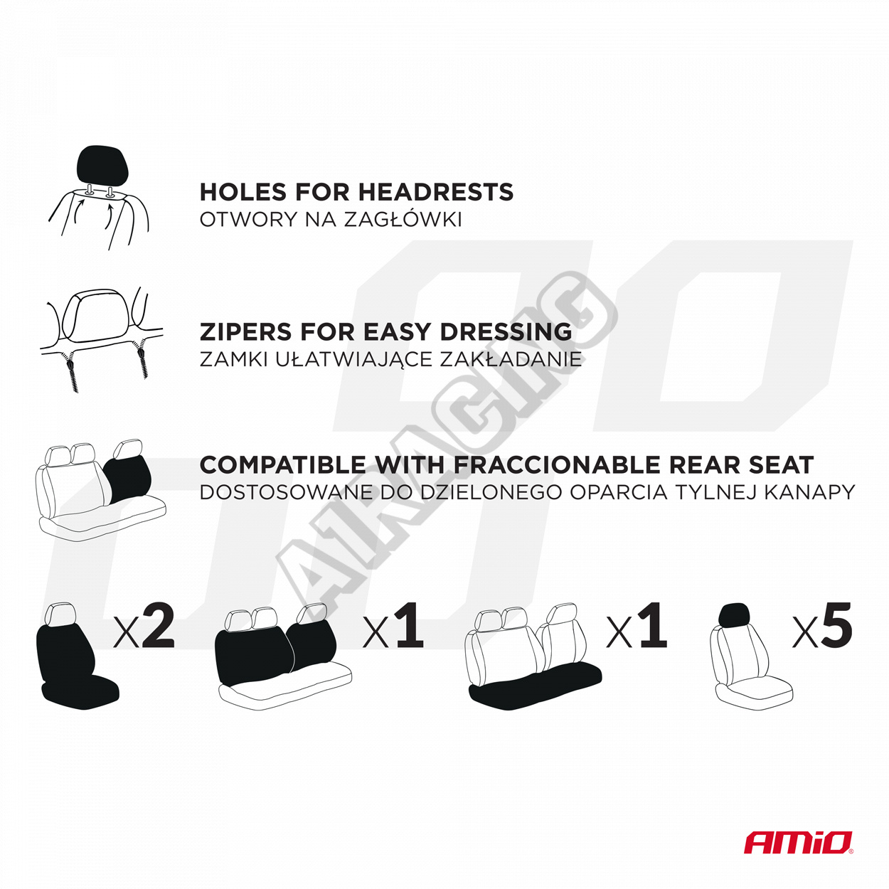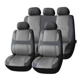 Súprava 9-dielna zahŕňa poťahy na dve predné sedadlá, zadnú delenú lavicu a súpravu opierok hlavy. Univerzálne prispôsobenie pre väčšinu modelov osobných automobilov.