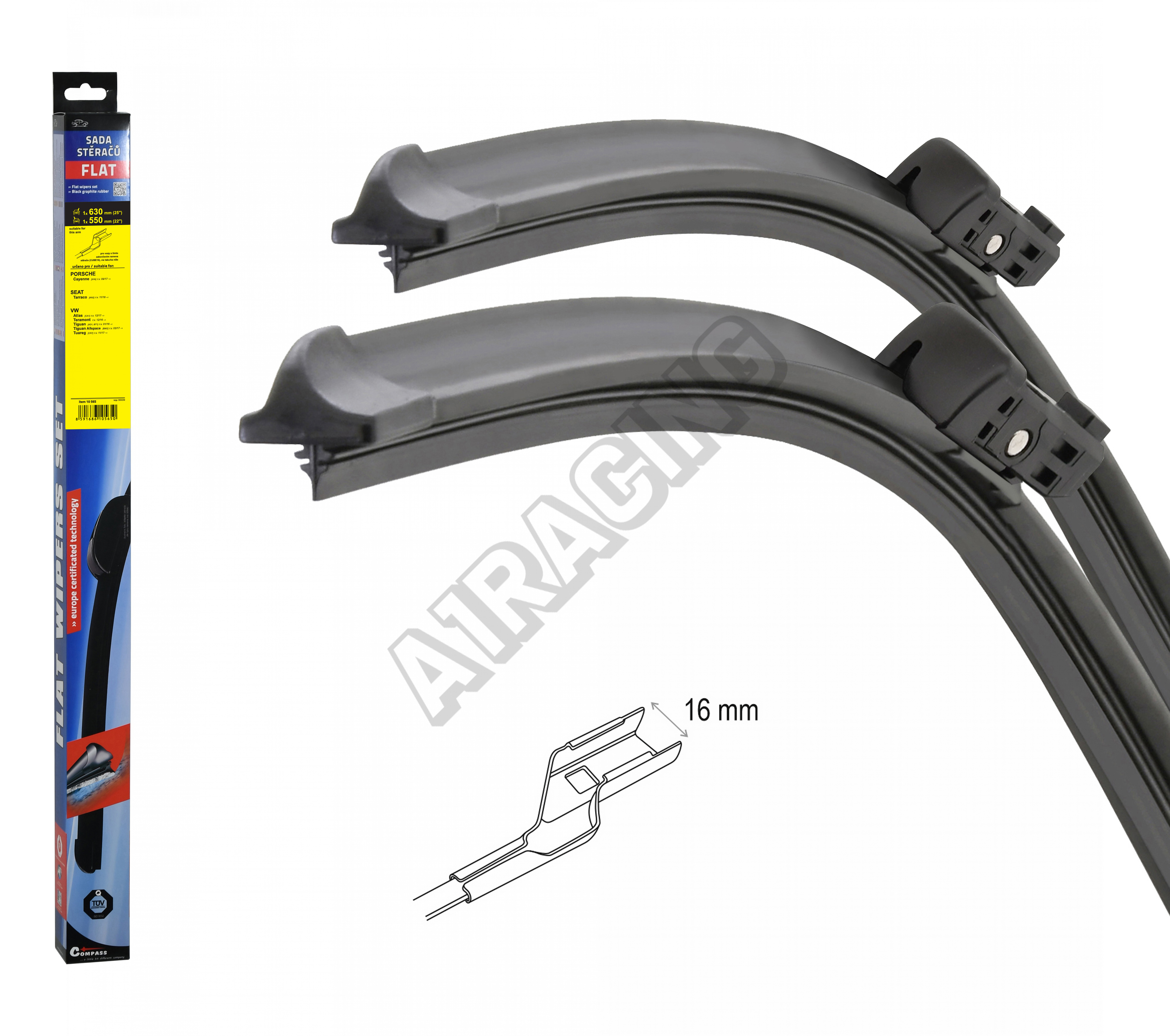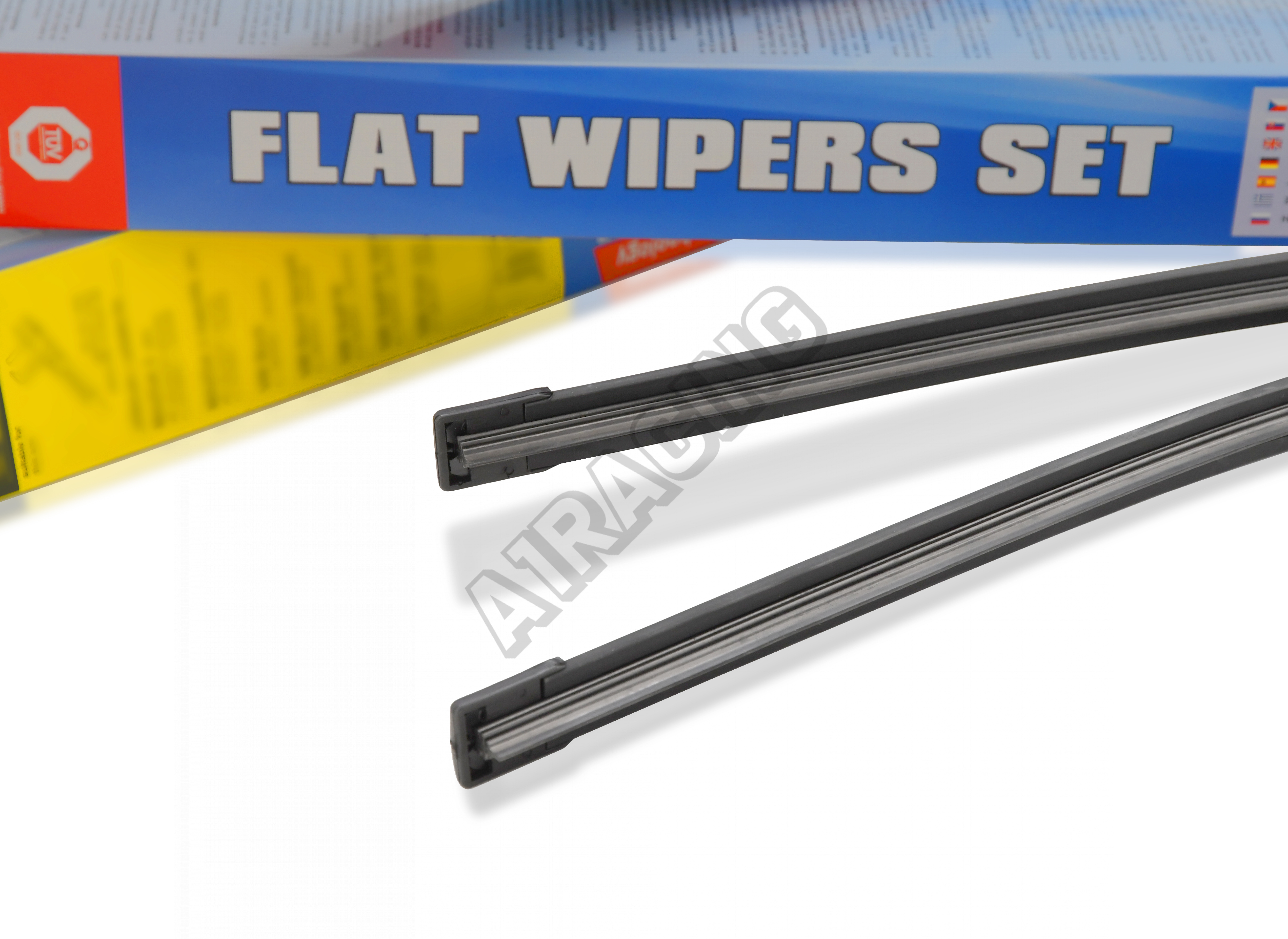 Sada dvoch plochých stieračov FLAT (vodič + spolujazdec) so špeciálnym uchytením. Dĺžky stieračov a systém uchytenia na ramienko sú prispôsobené vybraným vozidlám (pozri tabuľku použitie).