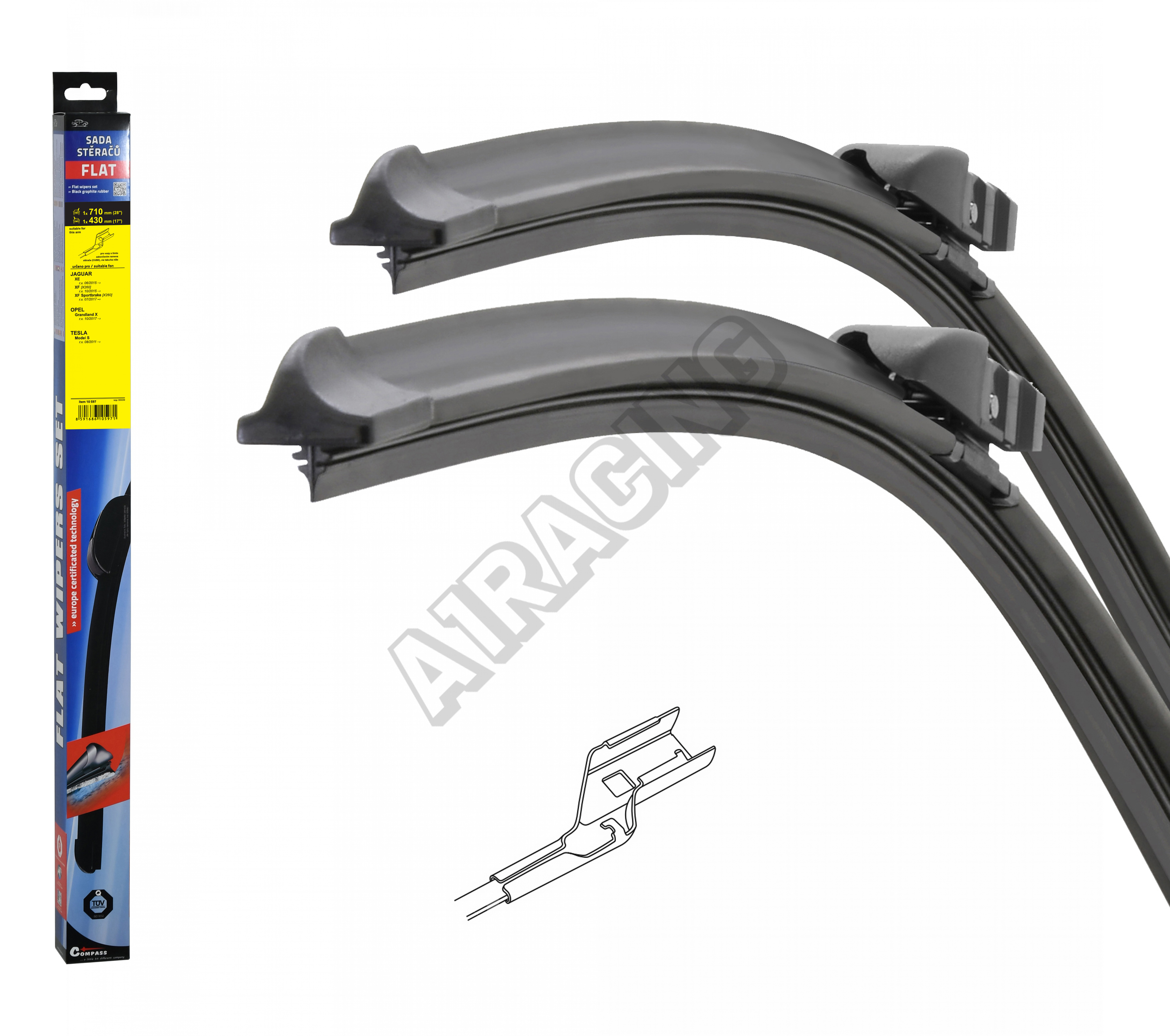 Sada dvoch plochých stieračov FLAT (vodič + spolujazdec) so špeciálnym uchytením. Dĺžky stieračov a systém uchytenia na ramienko sú prispôsobené vybraným vozidlám (pozri tabuľku použitie).