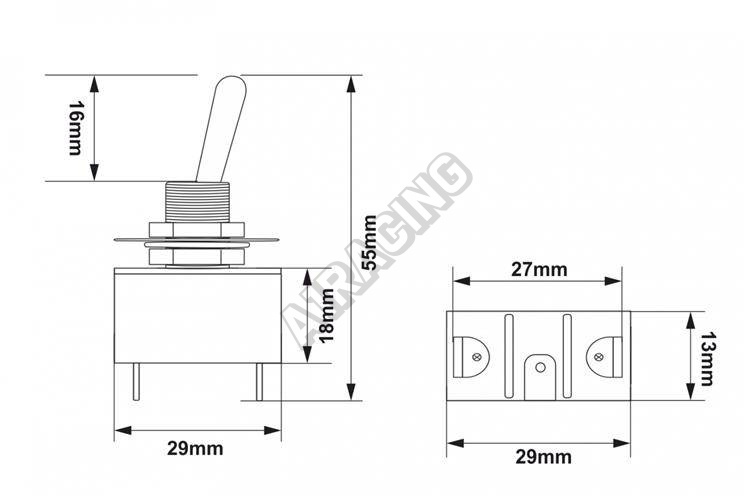 Univerzálny jednopolohový prepínač typu Toggle. Vyrobené z kovu. Napätie 12V, prúd 20A.
