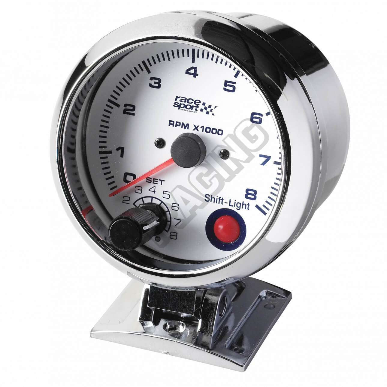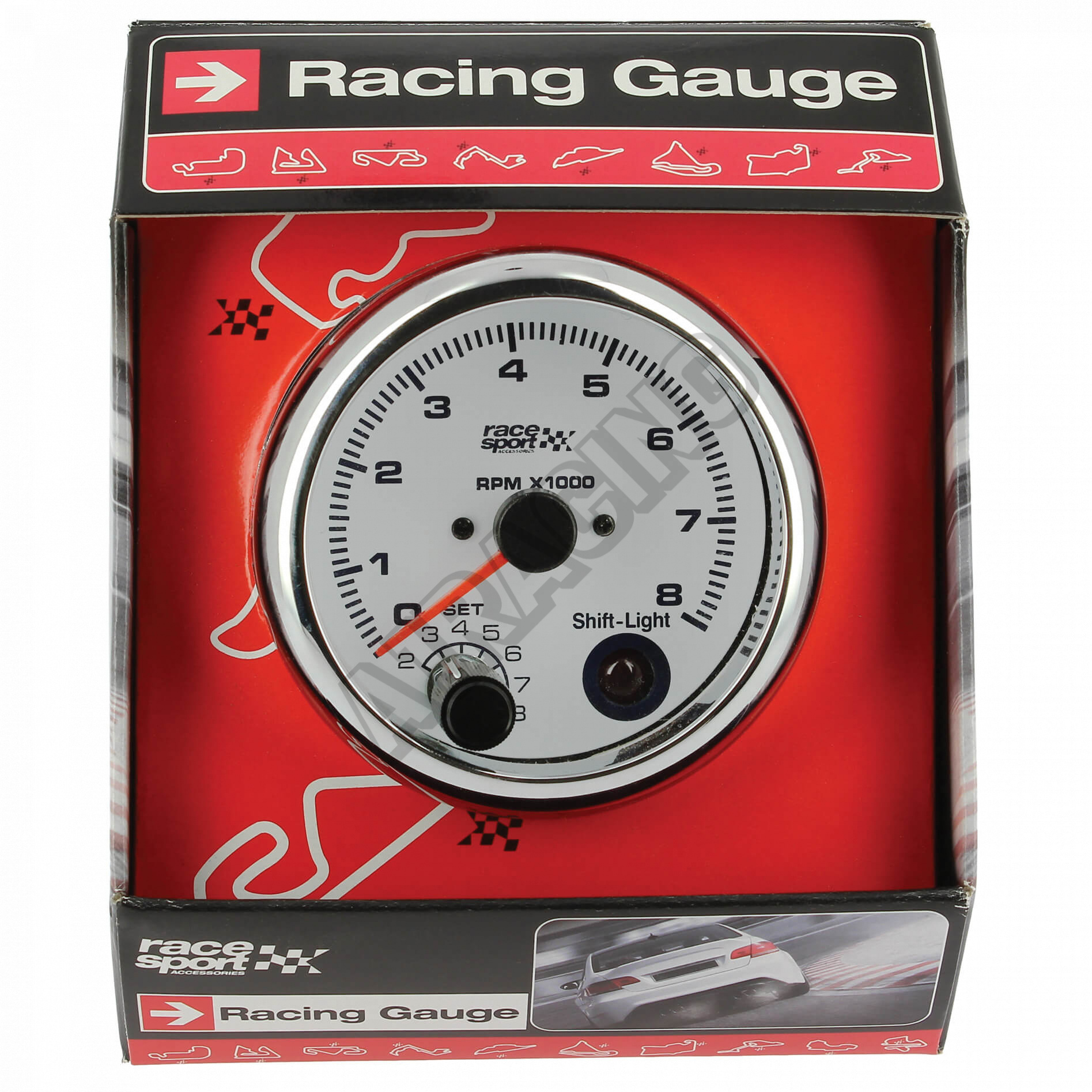 Prídavný otáčkomer Race Sport 90 mm 0-8000 RPM - nastaviteľný shift, biely