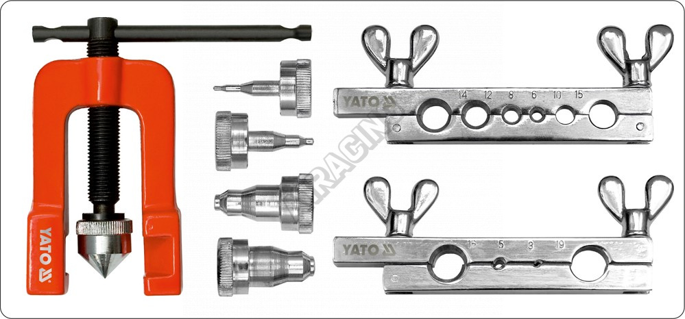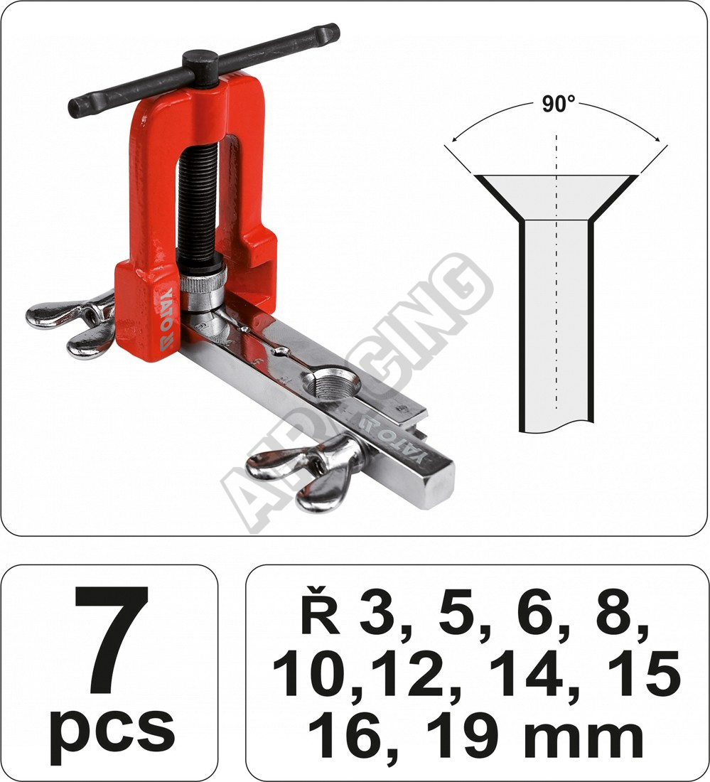 Lisovací nástroj pro ruční roztahování trubek a tváření kónických přírubových spojů s vrcholovým úhlem 90°.