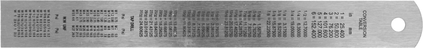 Na oboch okrajoch je milimetrová stupnica. Na druhej strane je prevodná tabuľka hodnôt závitov.