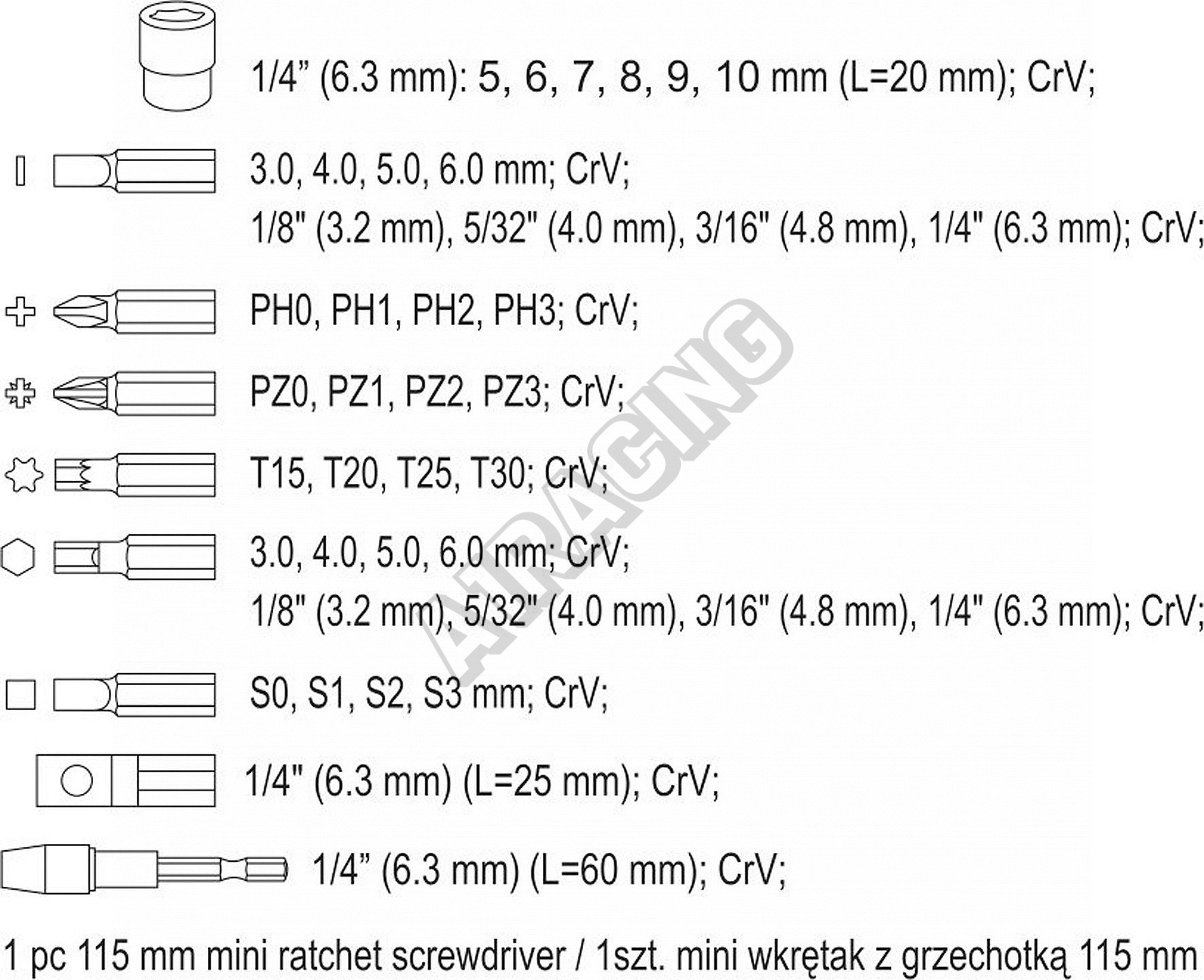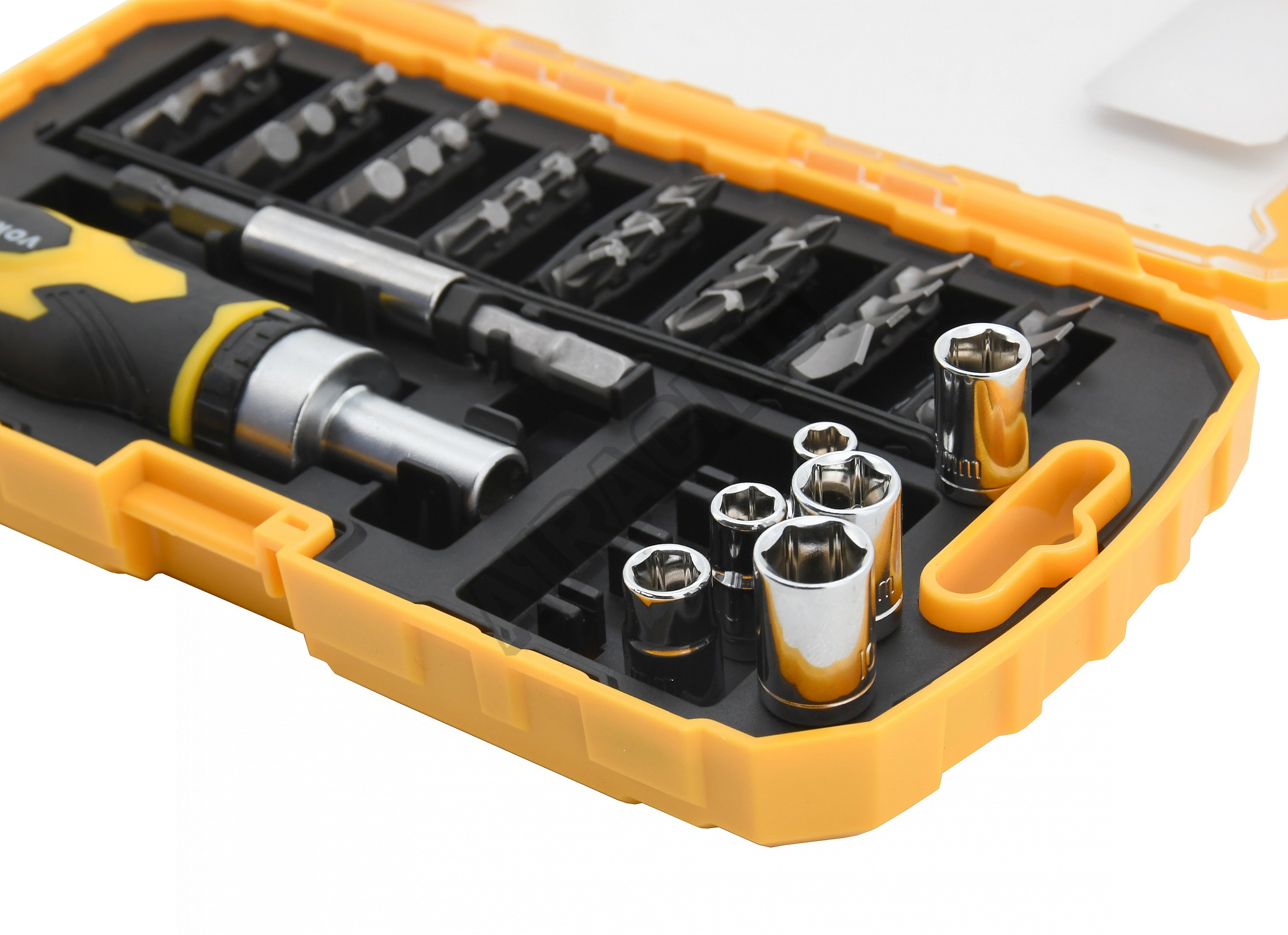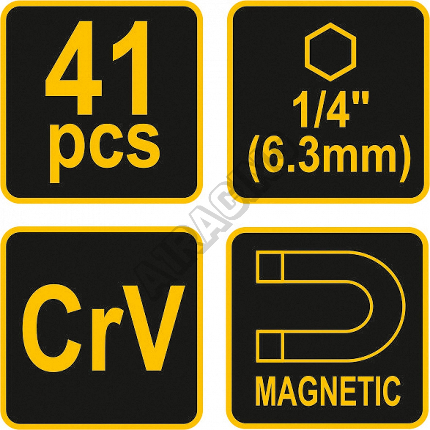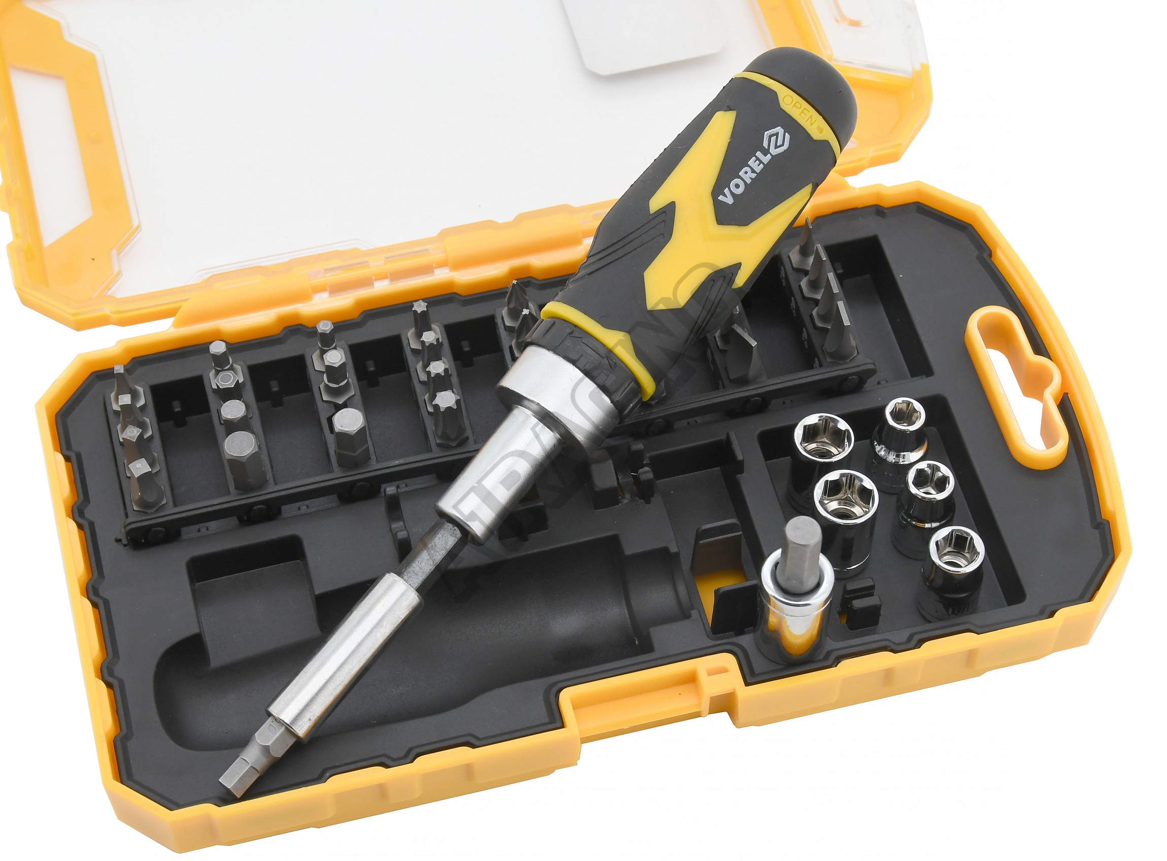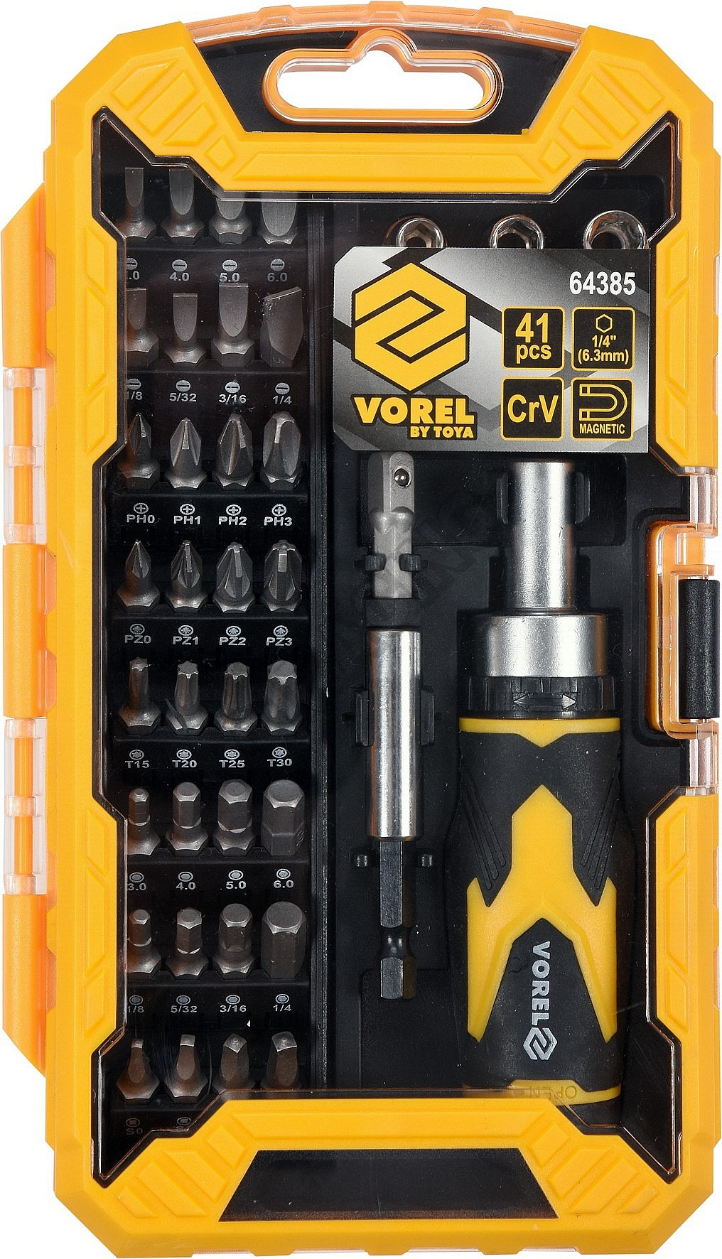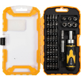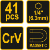 Nářadí je precizně zpracováno z CrV oceli a jednotlivé bity 1/4"(6,3 mm) jsou magnetické, čímž usnadňují práci se součástkami. Bytelné tělo ráčnového šroubováku je duté a po odšroubování zadní části je přístupné např. pro odkládání drobných součástek.