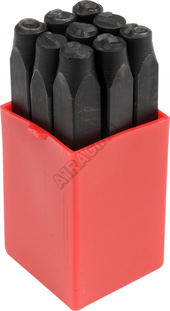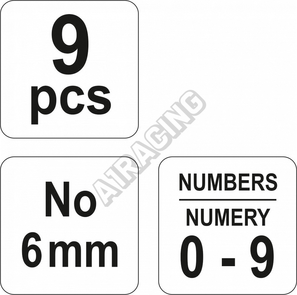Sada razníc s numerickými znakmi 0-9 o veľkosti 6mm. Pre číslicu 9 sa používa otočený razník 6.