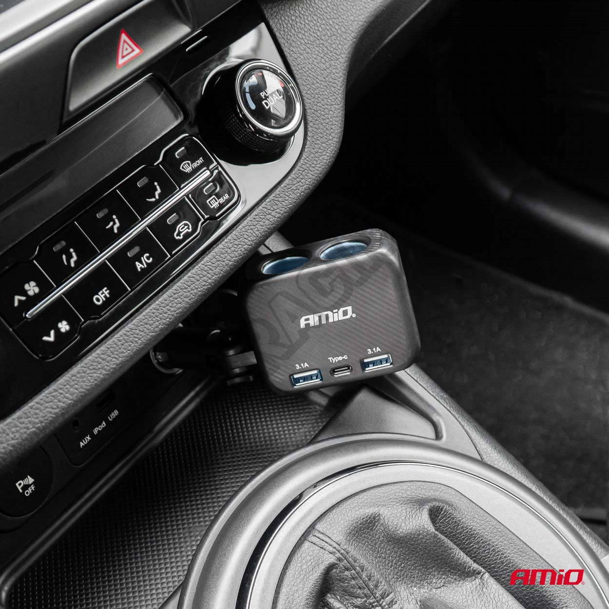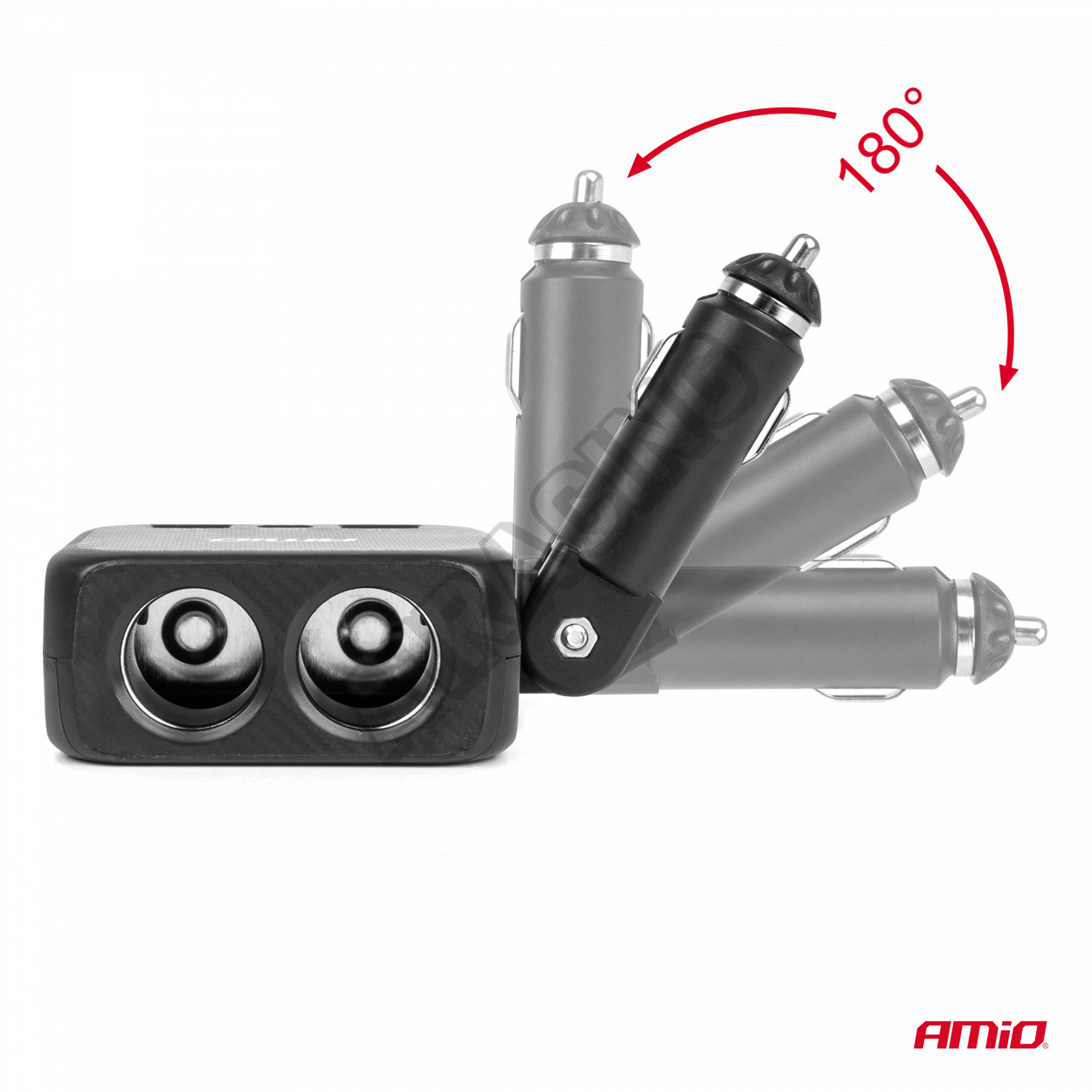 Rozdeľovač zásuvky zapaľovača s nabíjačkou 2x USB-A 1x USB-C 12V 24V 100W 180° AMIO-04357
