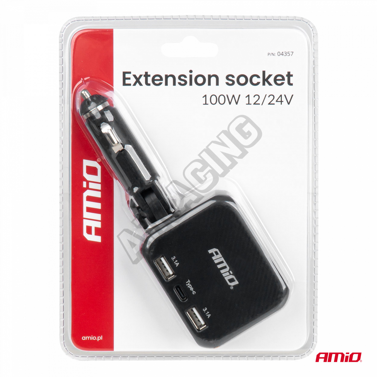 Rozdeľovač zásuvky zapaľovača s nabíjačkou 2x USB-A 1x USB-C 12V 24V 100W 180° AMIO-043576.74 EUR