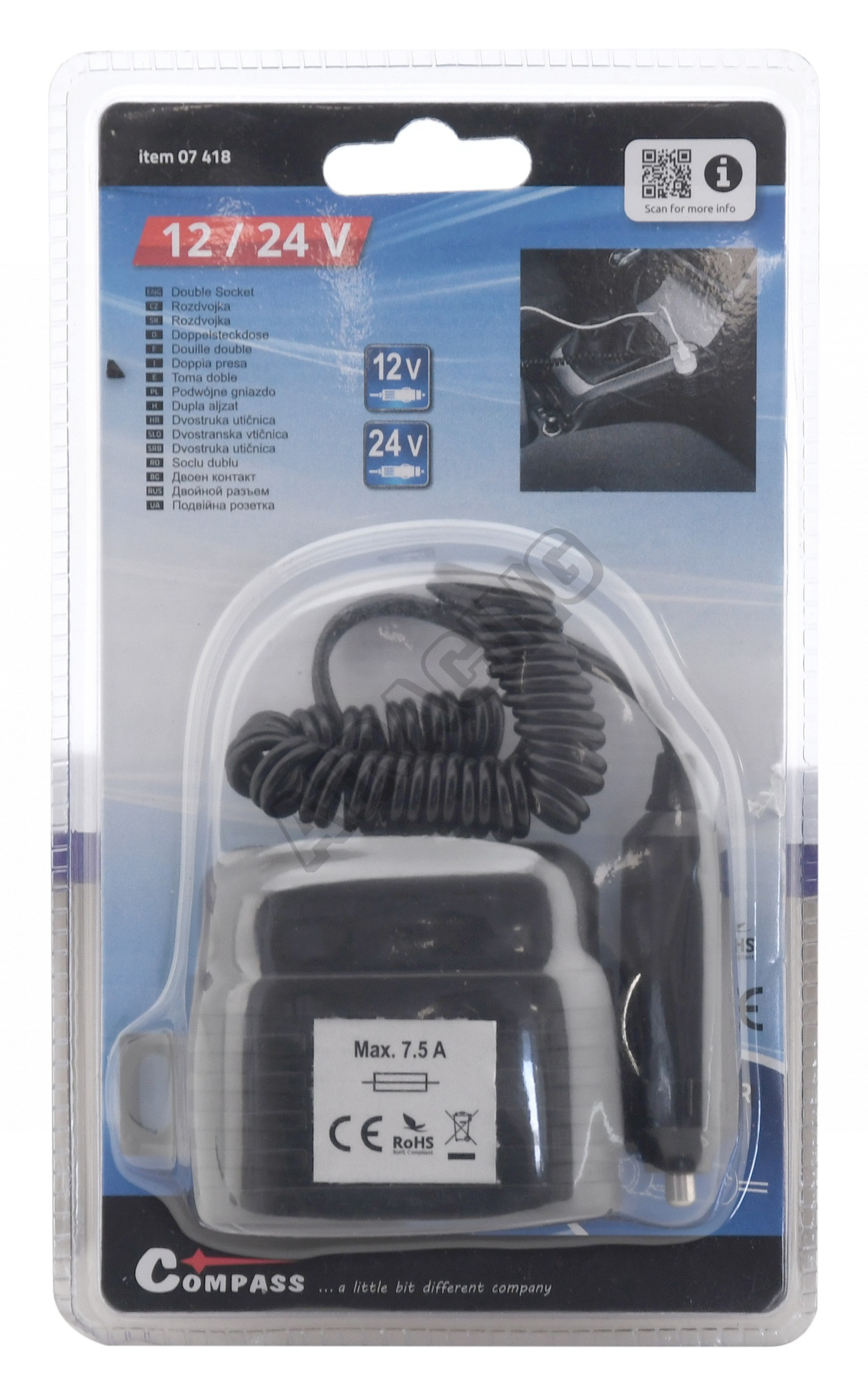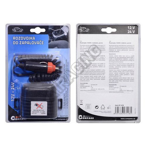 Rozdvojka zásuvky automobilového zapaľovača 12 V alebo 24 V. Umožňuje pripojenie dvoch spotrebičov k jednej štandardnej zásuvke zapaľovača v automobile.