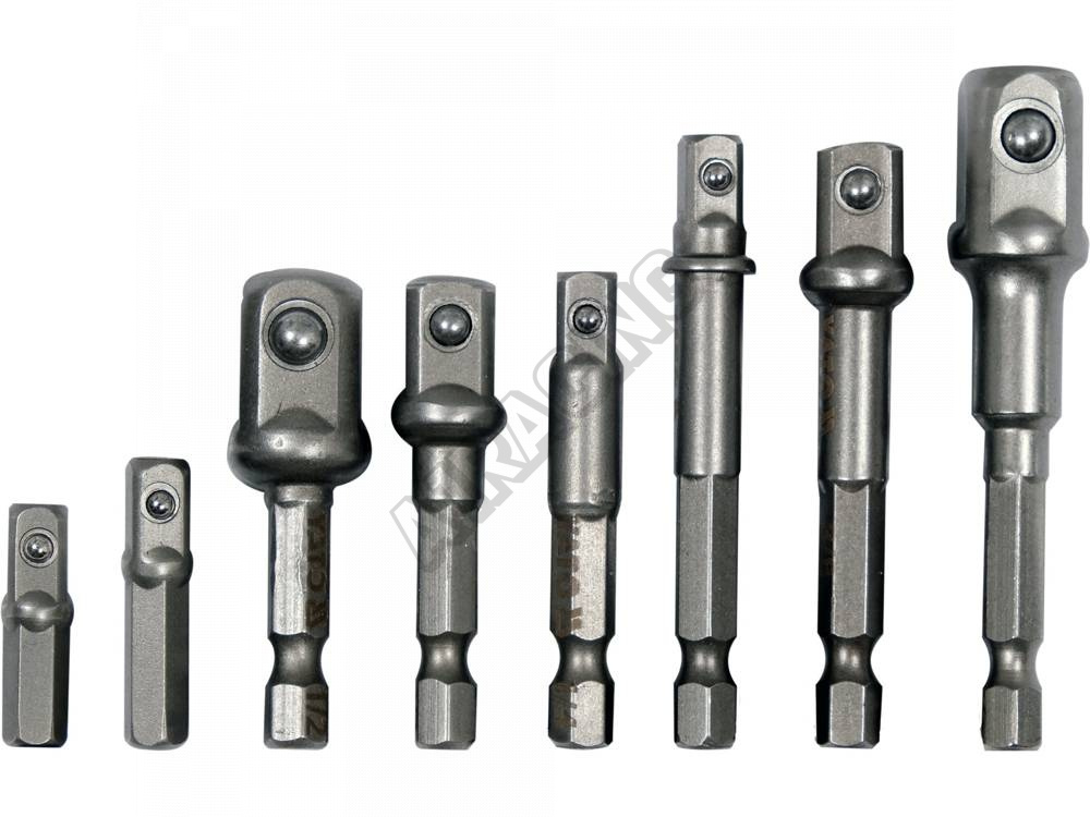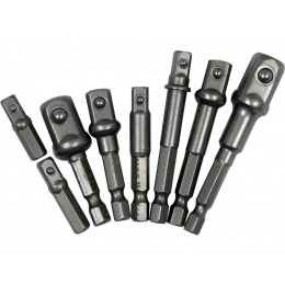 Sada adaptérů do vrtačky HEX 1/4" pro použití nástavců. Sada se skládá z 8 adaptérů 1/4", 3/8" a 1/2