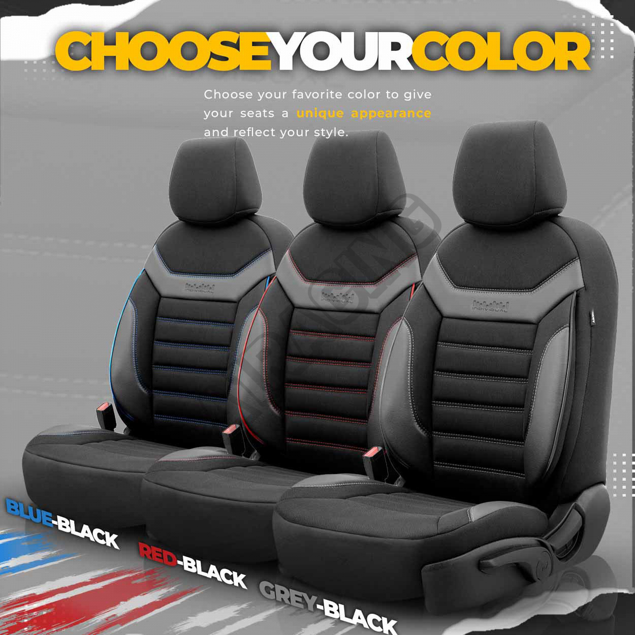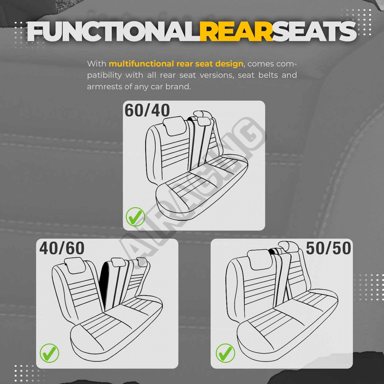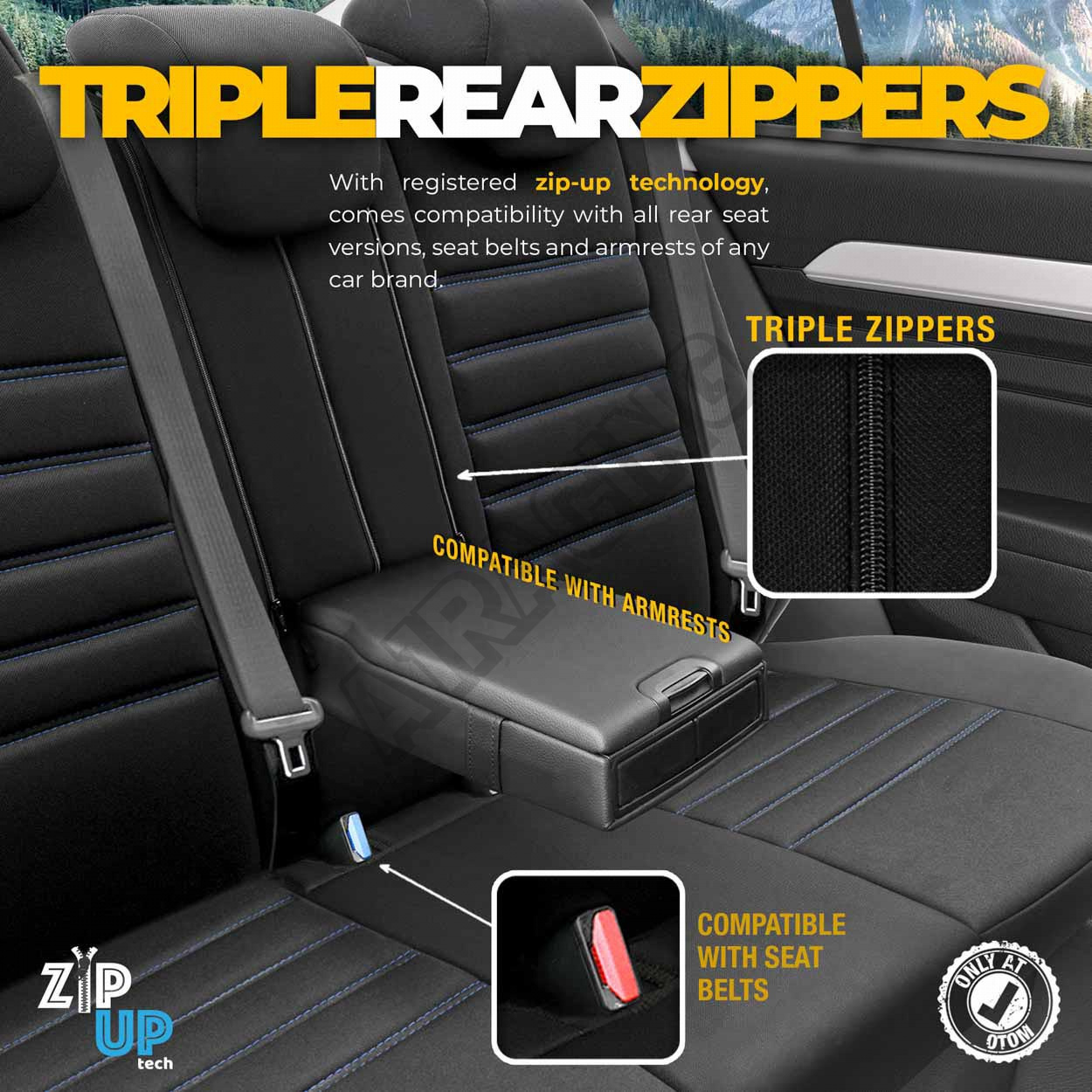 Poťahy majú zipsy na zadnej lavici, vďaka čomu pasujú na väčšinu sedadiel dostupných na trhu, (lavíc nedelených, delených vpravo aj vľavo).