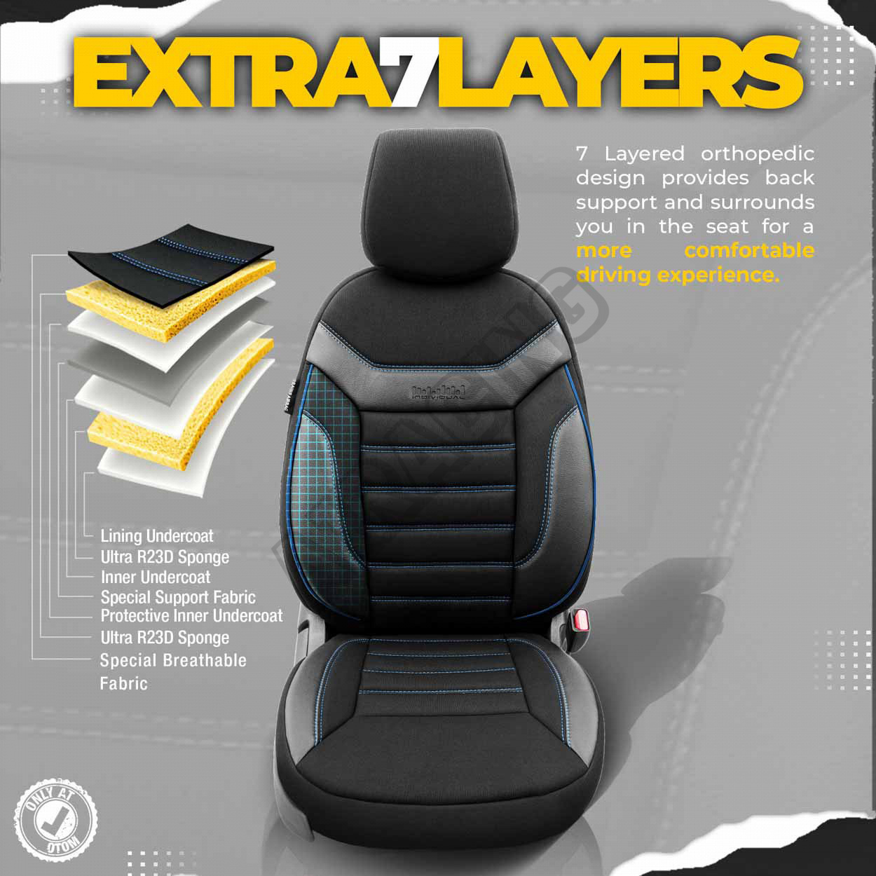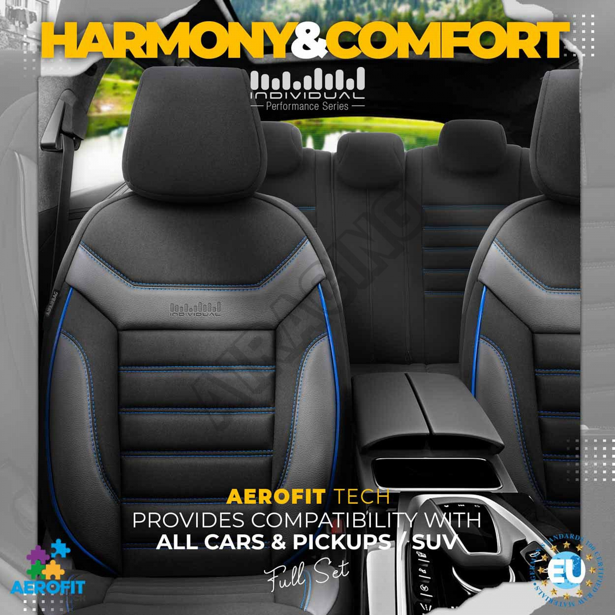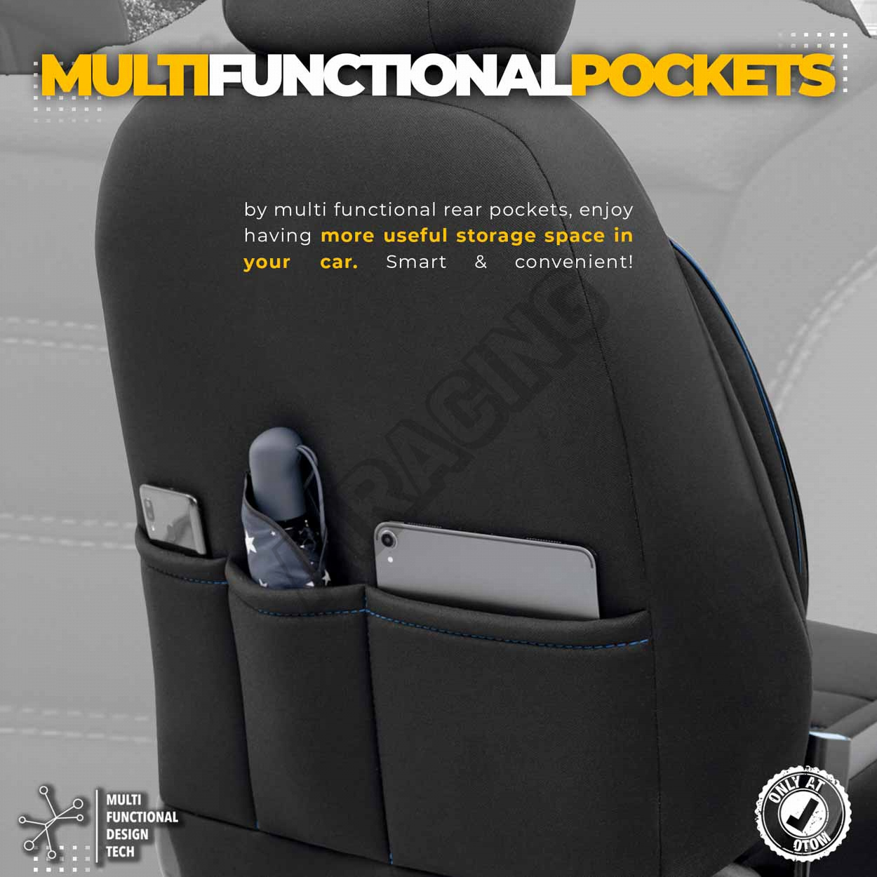 Poťahy majú zipsy na zadnej lavici, vďaka čomu pasujú na väčšinu sedadiel dostupných na trhu, (lavíc nedelených, delených vpravo aj vľavo).