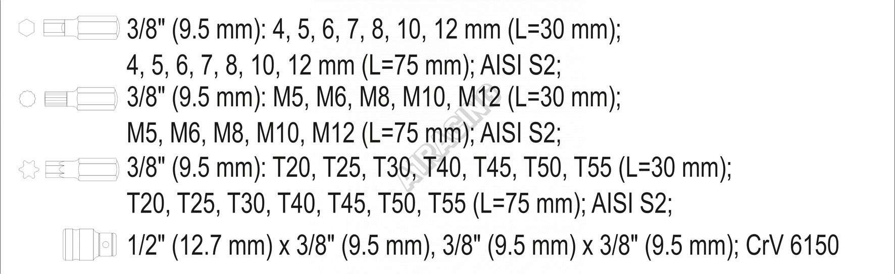 - 7x bit TORX T20, T25, T30, T40, T45, T50, T55 (75 mm)