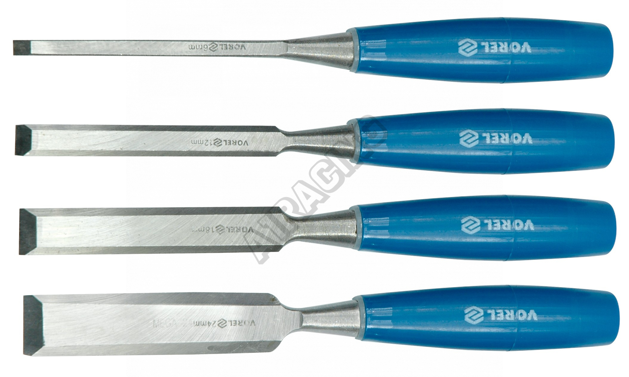 Zhotovení čepele nástrojů z kvalitní oceli CrV. Jednotlivé nástroje mají odstupňovanou šíři 6; 12; 18 a 24 mm.