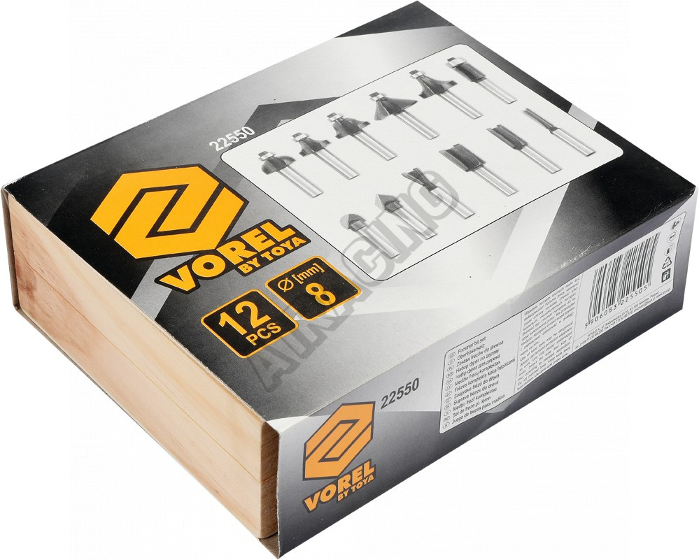 Sada dvanácti různých tvarových frézek pro měkké i tvrdé dřevo, překližku a dřevotřískové desky. Fré