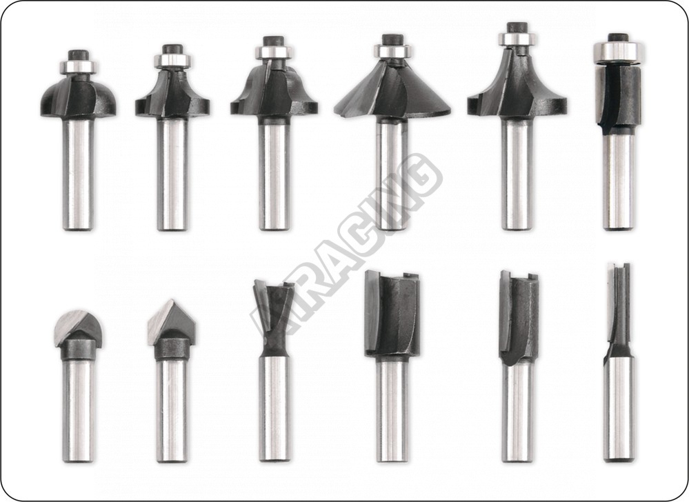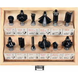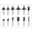 Sada dvanácti různých tvarových frézek pro měkké i tvrdé dřevo, překližku a dřevotřískové desky.