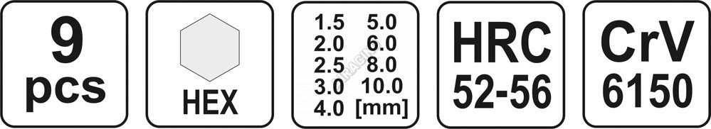 Jednotlivé klíče jsou zhotovené z kvalitní chromvanadiové slitiny oceli CrV 6150, zajišťující dlouhou životnost a korozivzdornost. Díky zvolenému materiálu je tvrdost jednotlivých imbusových klíčů HRC 52-55.