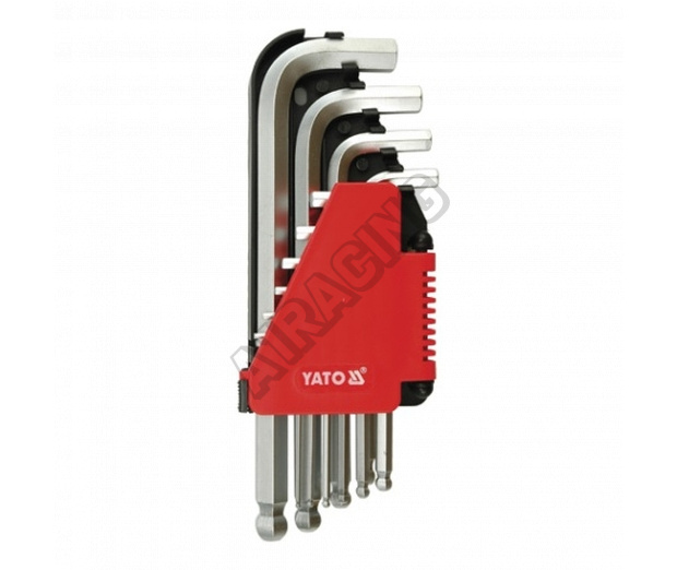 Sada 10 ks delších imbusových klíčů běžných rozměrů s kuličkou, uložených v přehledném, plastovém držáku.