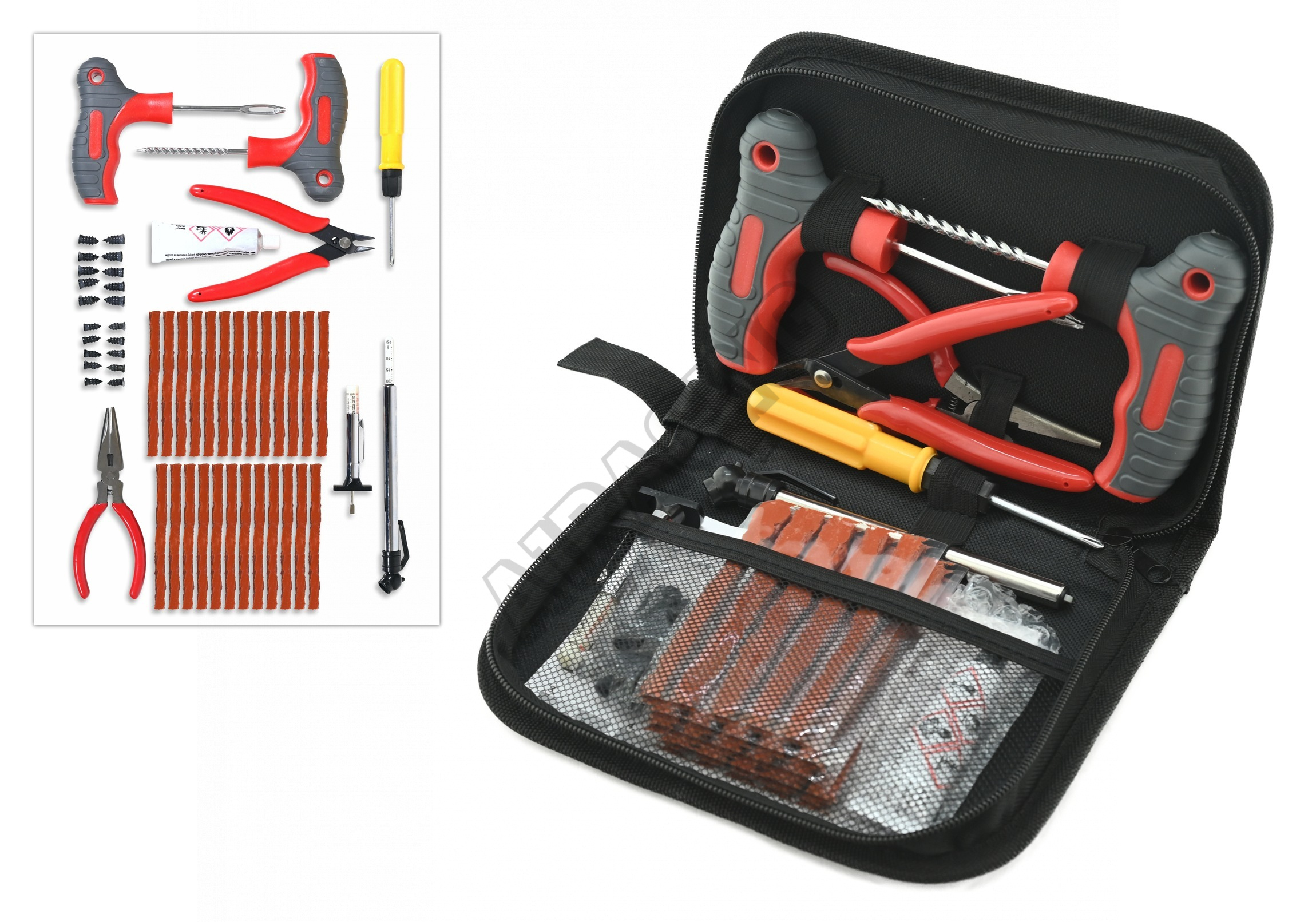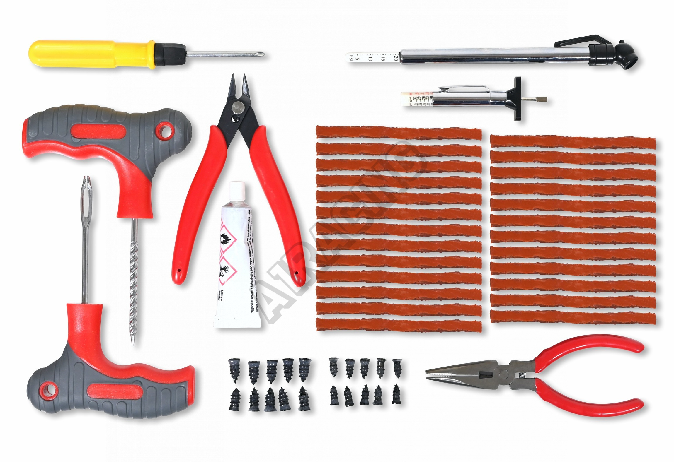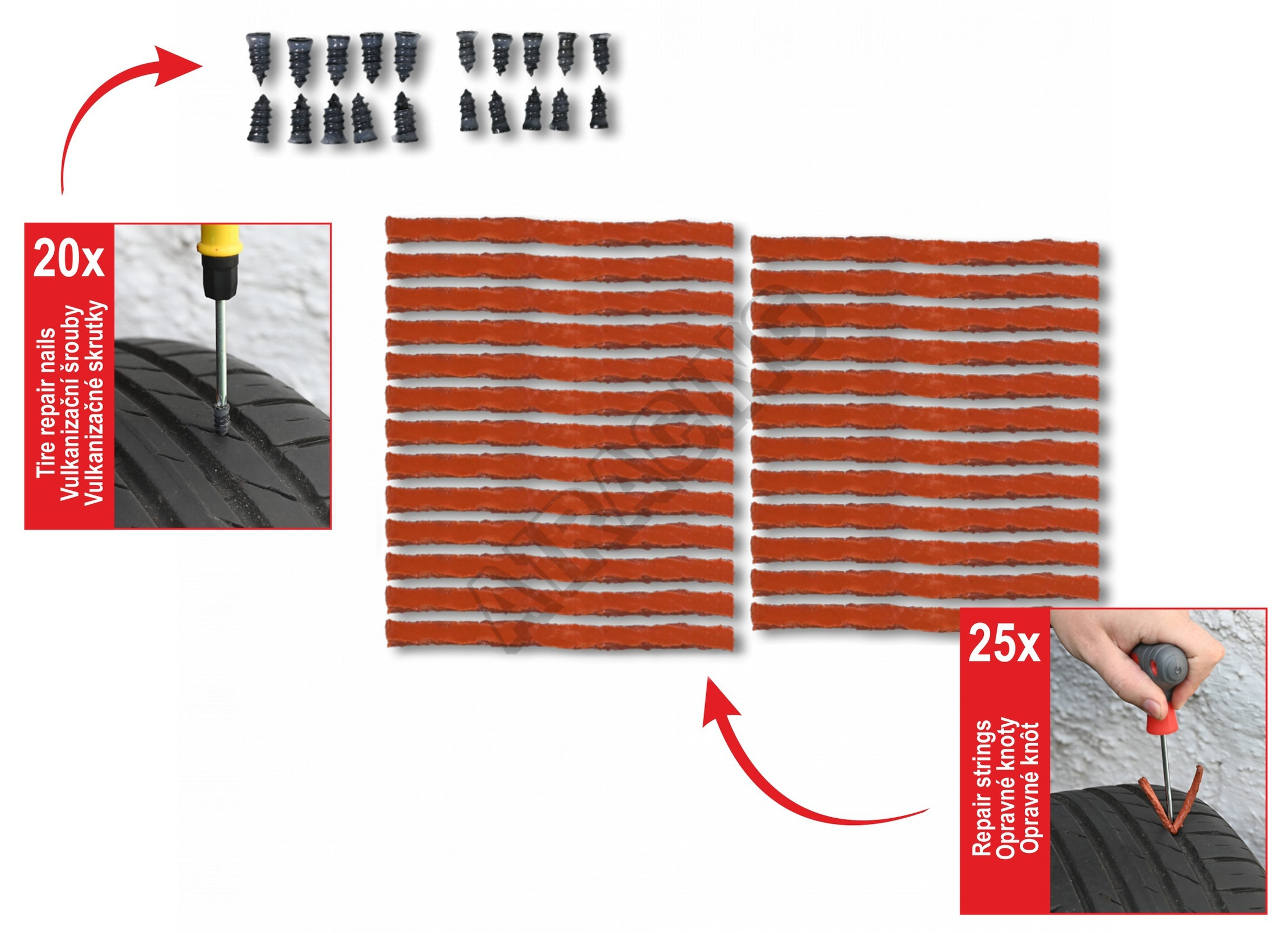 Sada obsahuje klasické opravné knoty včetně veškerého nářadí potřebného pro opravu, ale také vulkanizační šrouby, které opravu pneumatiky ještě více zjednoduší. Vulkanizační šrouby jsou speciální samořezné šrouby s hrubým závitem a vrstvou těsnicí hmoty. Součástí sady jsou rovněž další nástroje pro kontrolu stavu pneumatik, měříč hloubky dezénu a tlakoměr.