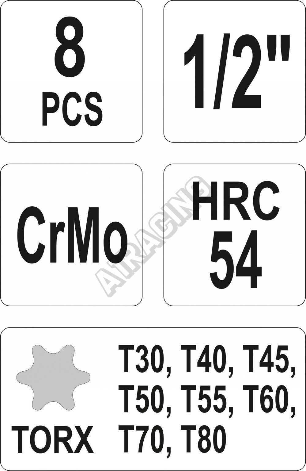 Sada kovaných ořechů torx T30, T40, T45, T50, T55, T60, T70, T80, s vnitřním čtyřhranem 1/2", celková délka 78mm. Vyrobeno z vysoce kvalitní chrom-molybdenové slitiny tvrdosti HRC54.