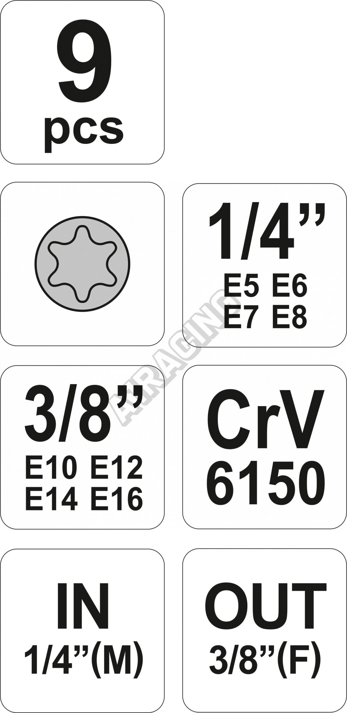 Sada nástavců 1/4", 3/8" TORX 9 ks E5-E16