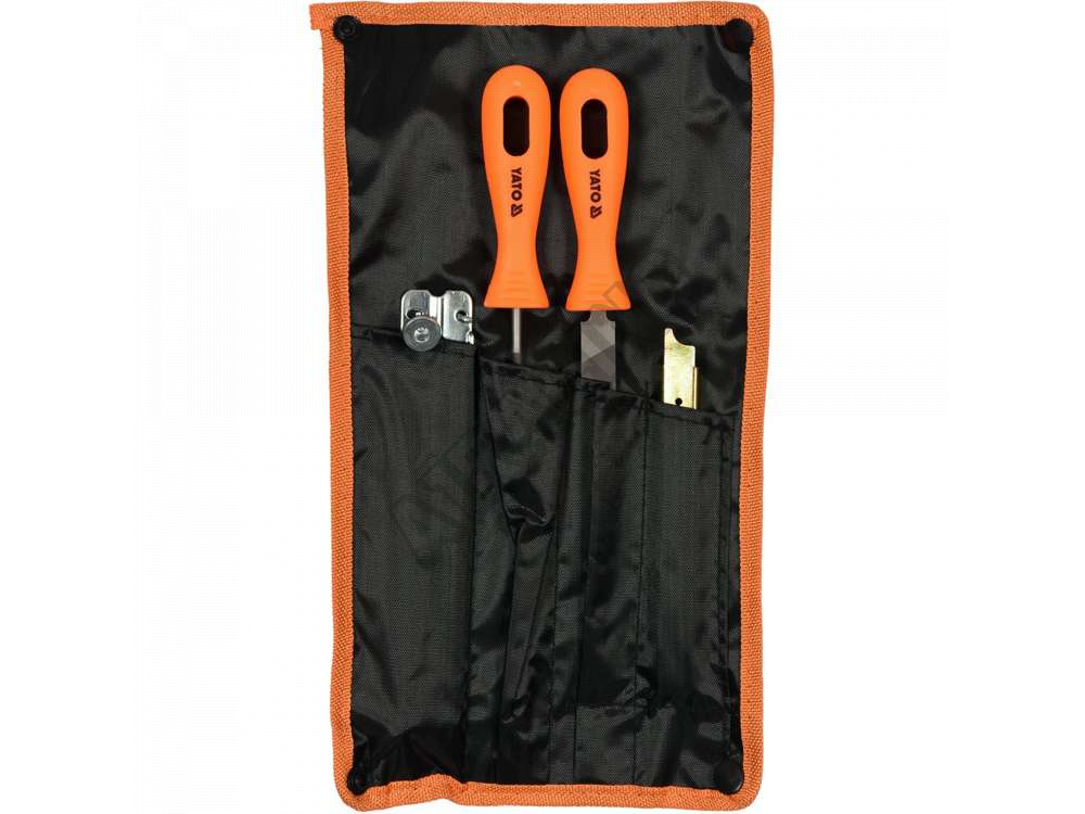Čtyřdílná sada pro ostření pilových řetězů. Obsah balení: Kulatý pilník Držák pilníku Plochý pilník
