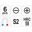 Vyrobeno z nerezové oceli S2 tvrzené na HRC 58. Hrot šroubováků je kalený a pískovaný, což zabezpečuje jejich dlouhodobou pevnost a životnost.