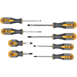Sada 8ks šroubováků vyrobených z CrV6150 oceli s ergonomicky tvarovanými rukojeťmi z protikluzného PP a TPR.