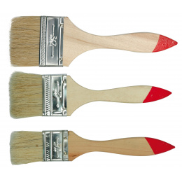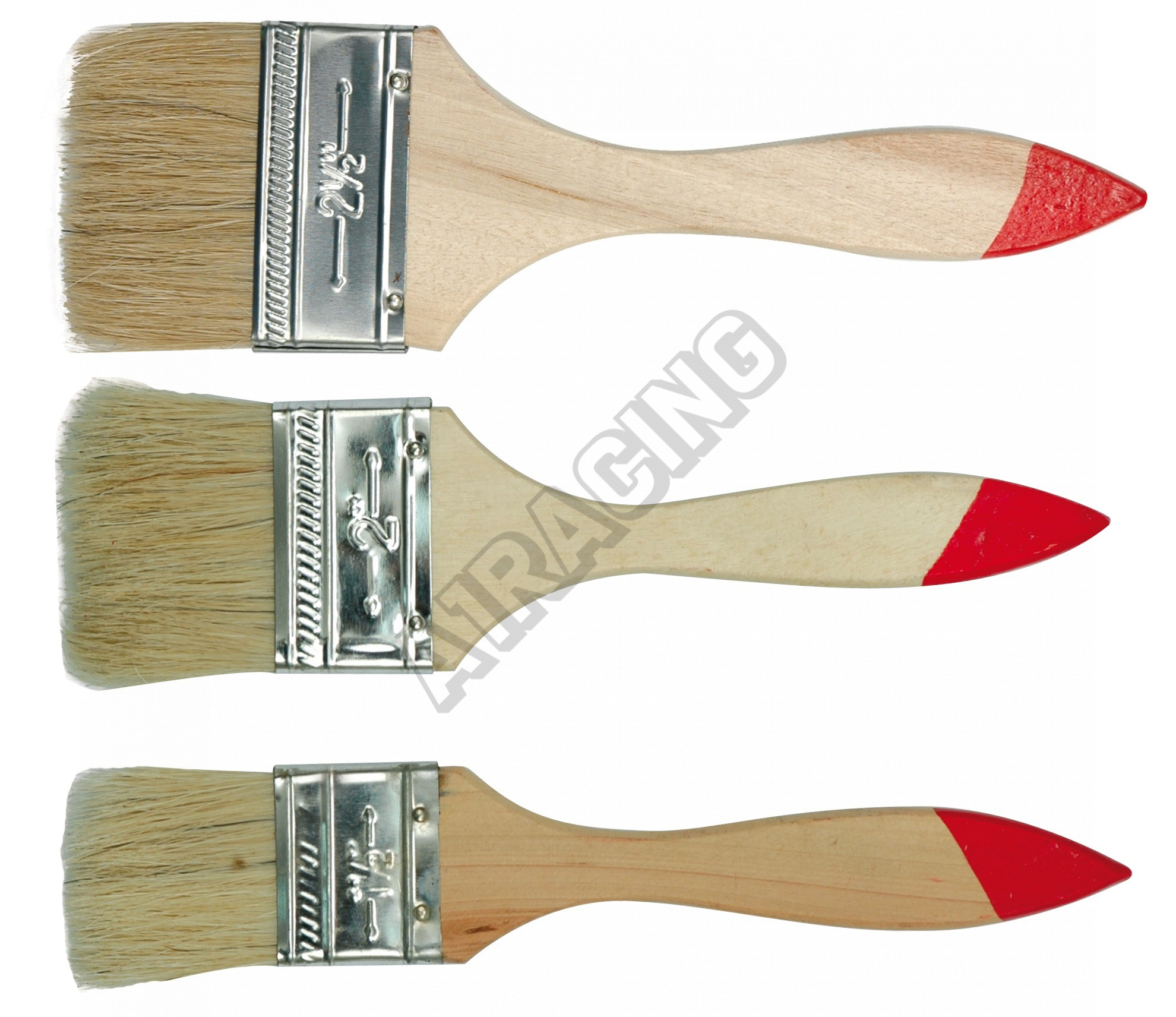 Sada tří plochých štětců anglického typu. Štětiny orámované kovovou objímkou ??na dřevěné lakované rukojeti.