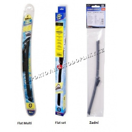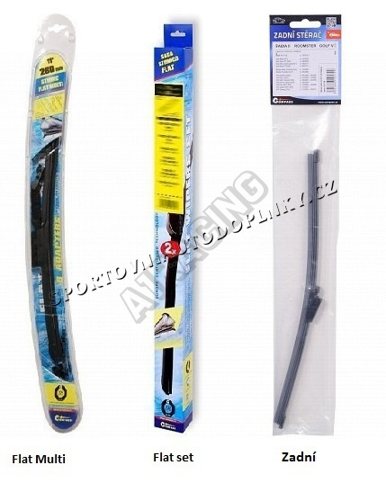 Stěrače FLAT SET (sada 2 ks na celé auto). Vysoce kvalitní pružný člen plochého stěrače zajišťuje stejnoměrný tlak grafitového břitu v celé jeho délce, což zamezuje rozmazávání nečistot a vytváření pruhů.