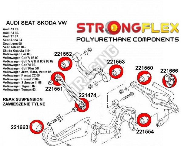 Seat Leon II 2005+ StrongFlex Sport sestava silentbloků jen pro zadní nápravu 16 ks obsahuje: