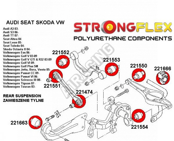 Seat Toledo III od 2005 StrongFlex (tvrdost 80ShA) kompletní sestava silentbloků na celé auto obsahuje :