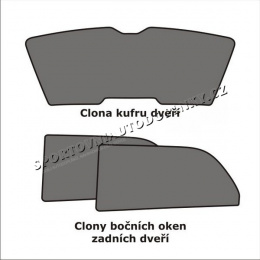 Súprava - 3 dielov. Clony tienia zvnútra celú plochu okien. Jednoduchá montáž/demontáž nasadením zvnútra vozidla. Clony sú vyrobené z čiernej tkaniny a majú oceľový pružný rámček.